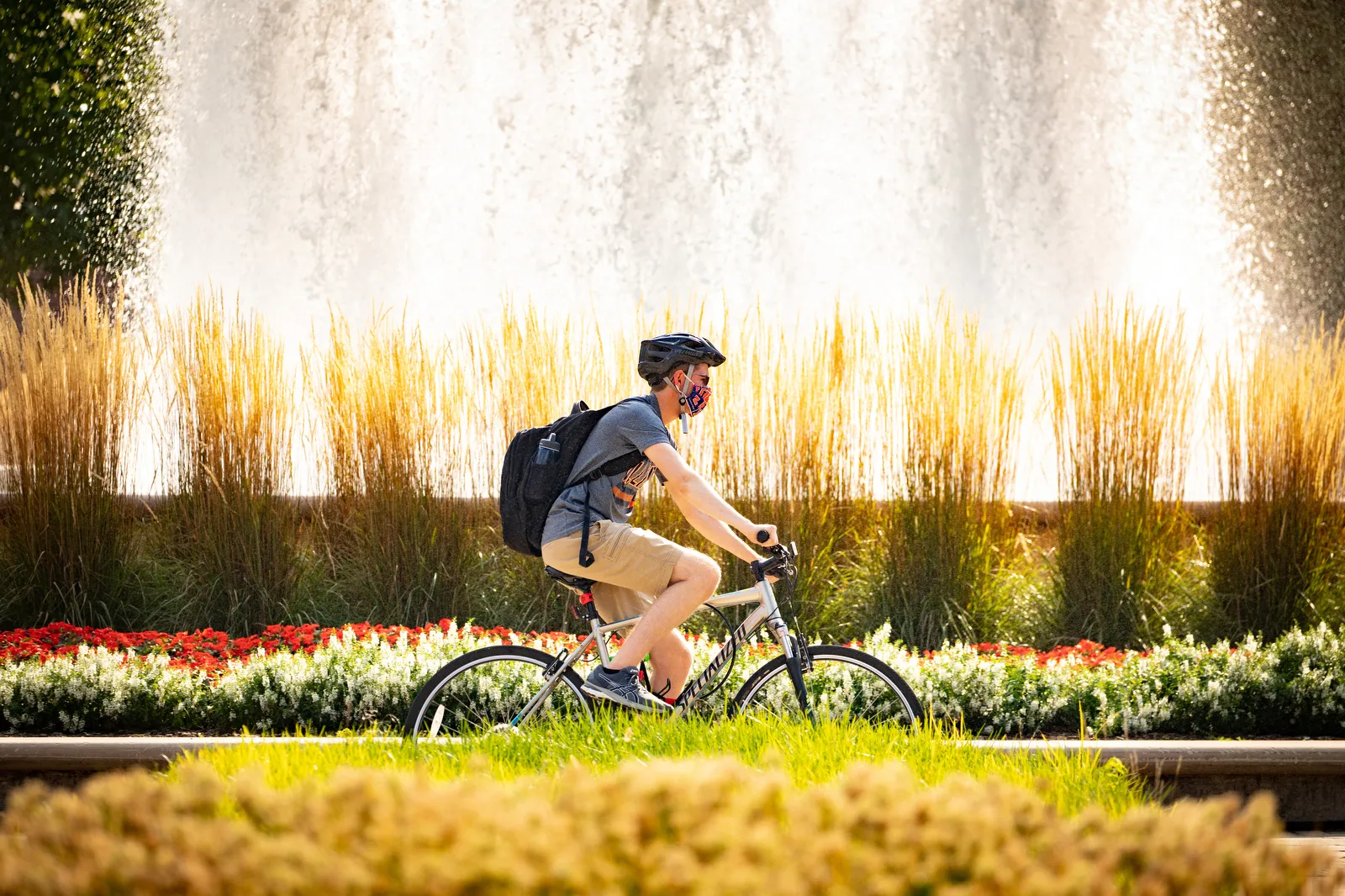 Sunlight backlights the fountains as bike riders take advantage of the beautiful weather during bike week on campus.