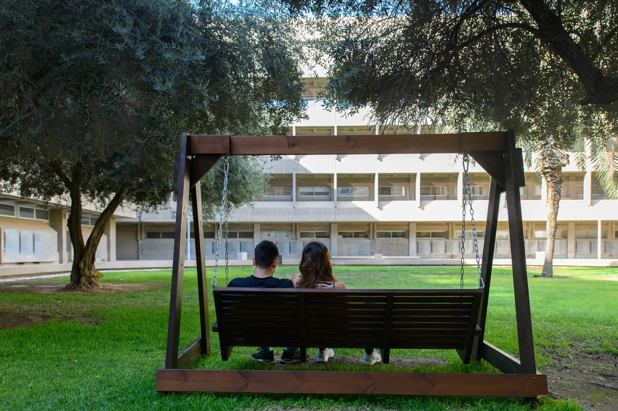 Barge Hall is framed by the over 100-year-old oak trees on the south side of campus.