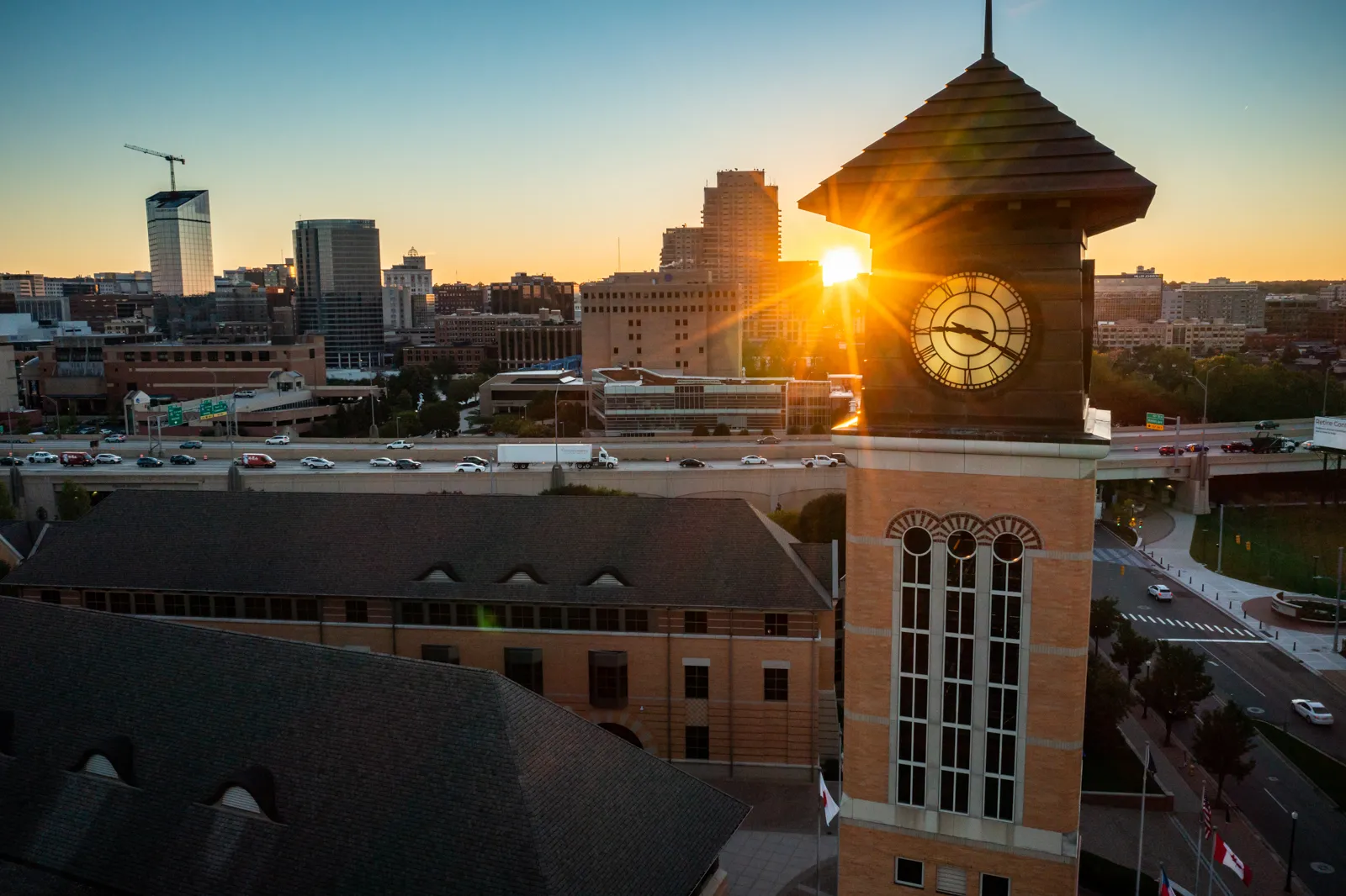 The sun rises behind the Beckering Family Carillon Tower on the Pew Campus of Grand Valley State University.