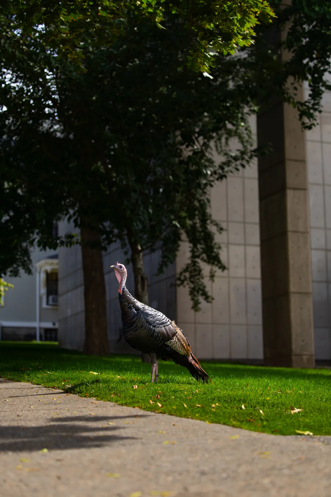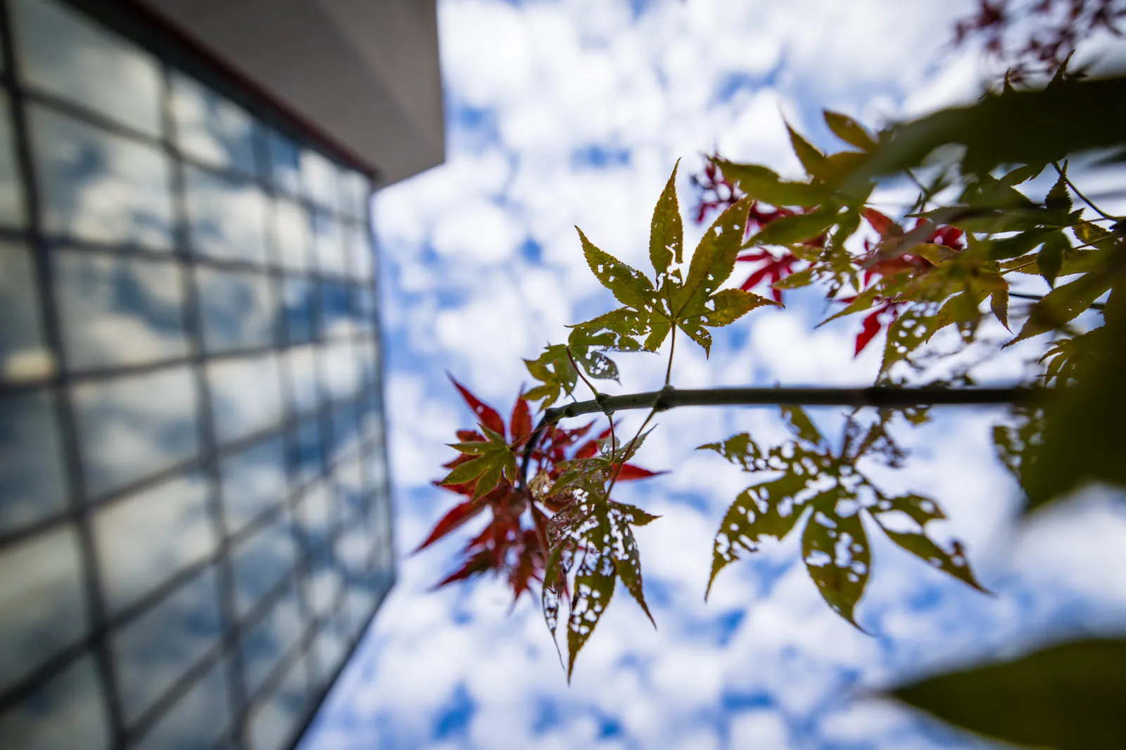 Colorful leaves, weathered with delicate holes, reach toward the sky beside the University Library—capturing the changing season and the beauty of fall on campus.