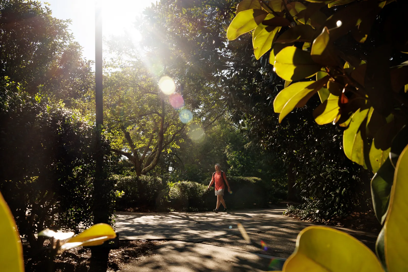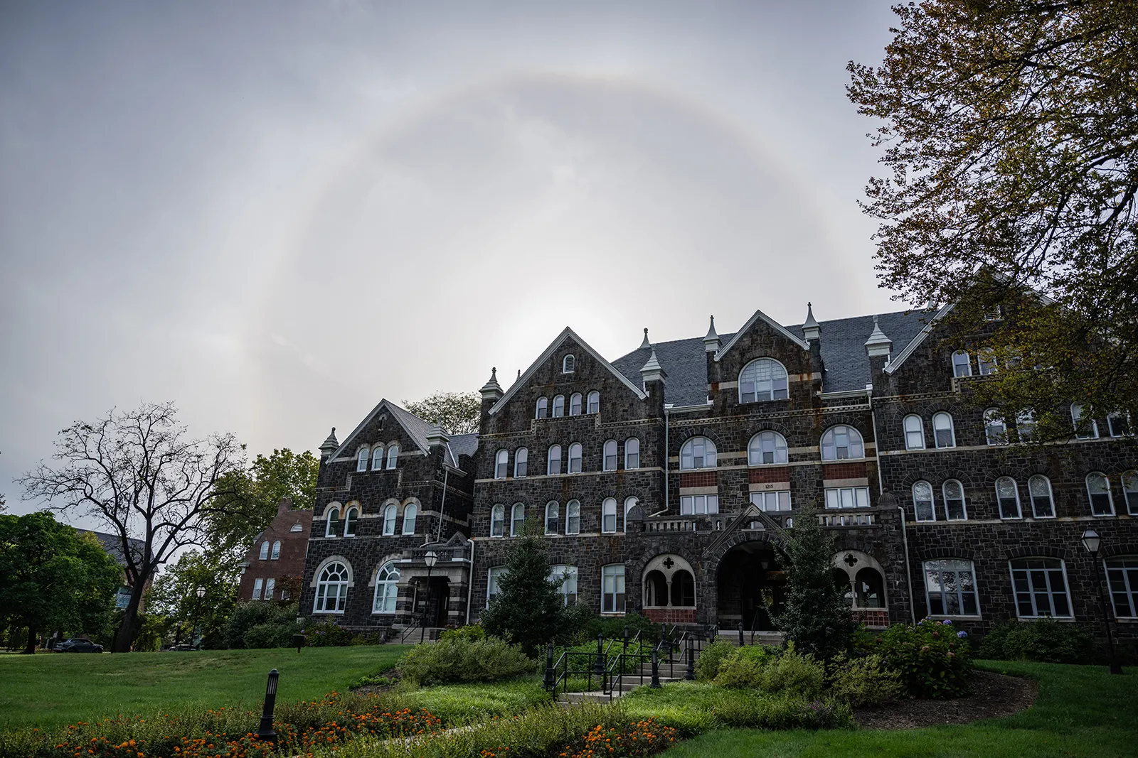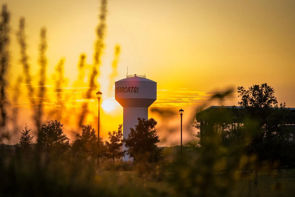 The sun dips low over campus, painting the sky in warm shades of gold, pink, and orange.