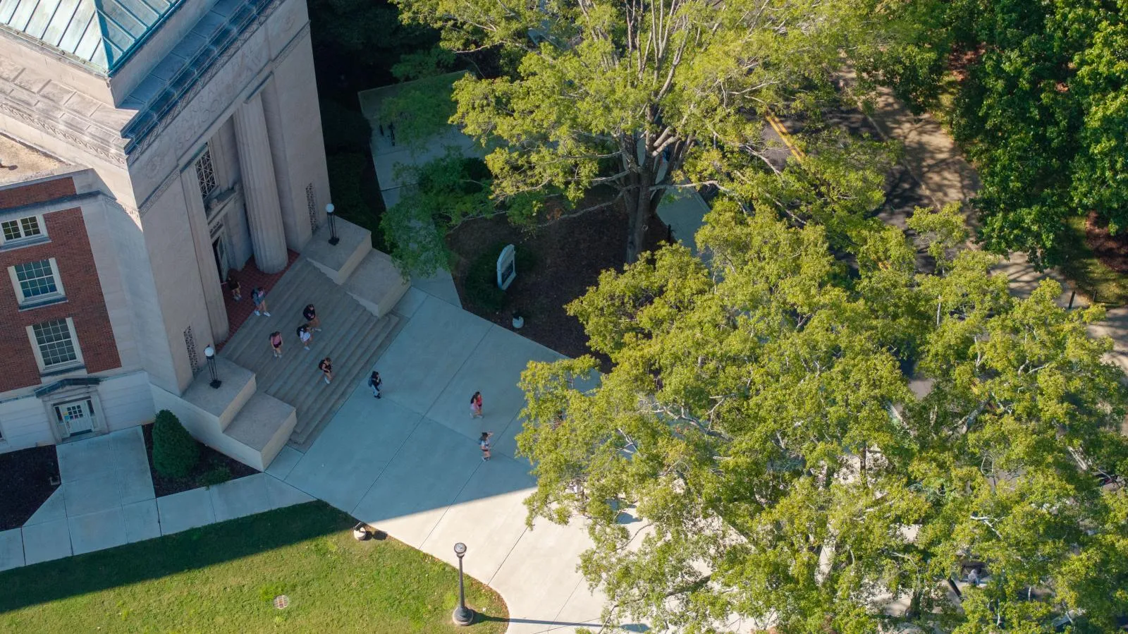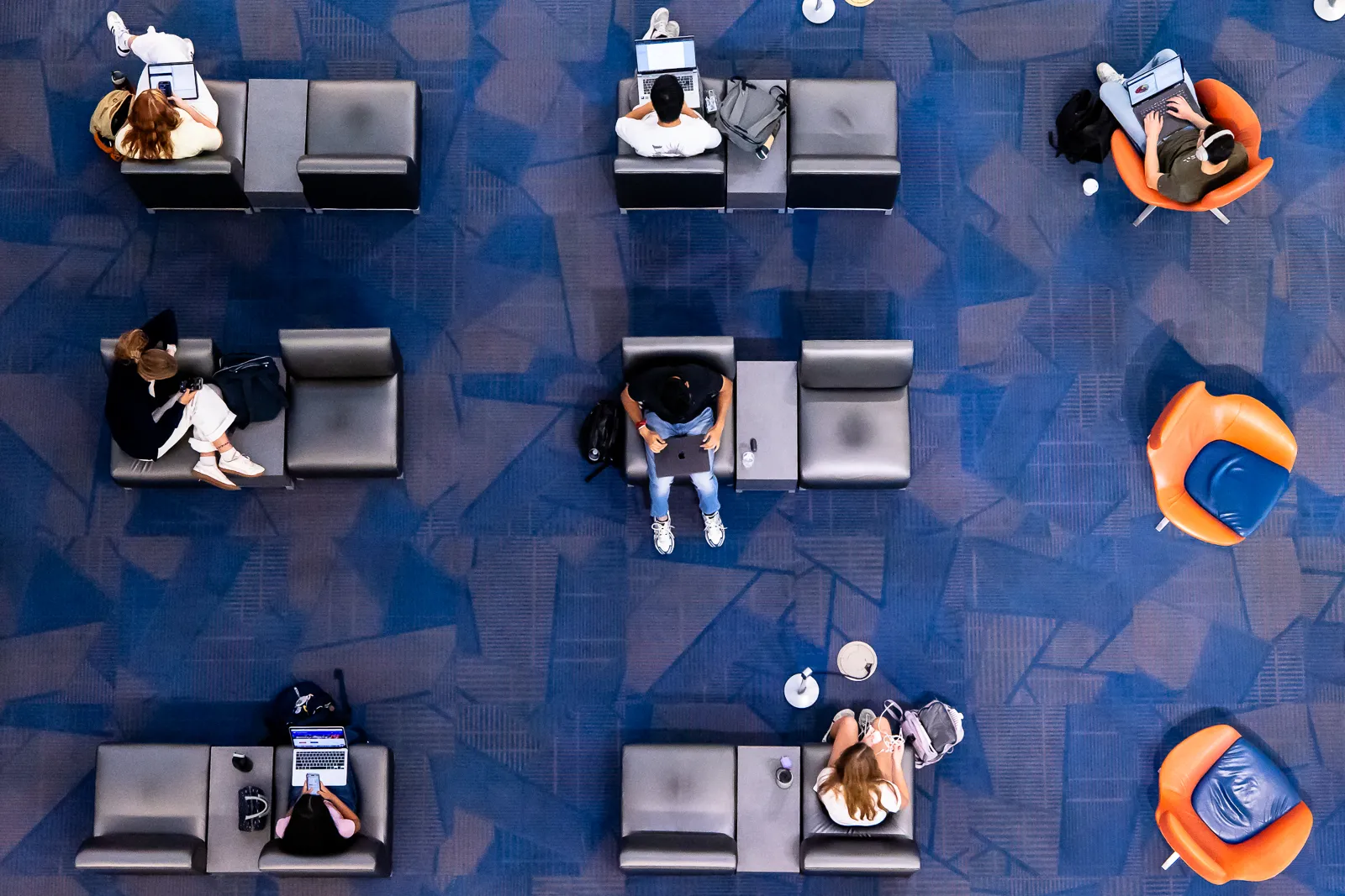 An overhead image of seven students sitting and studying in the Reitz Union Atrium on Monday, September 15, 2025