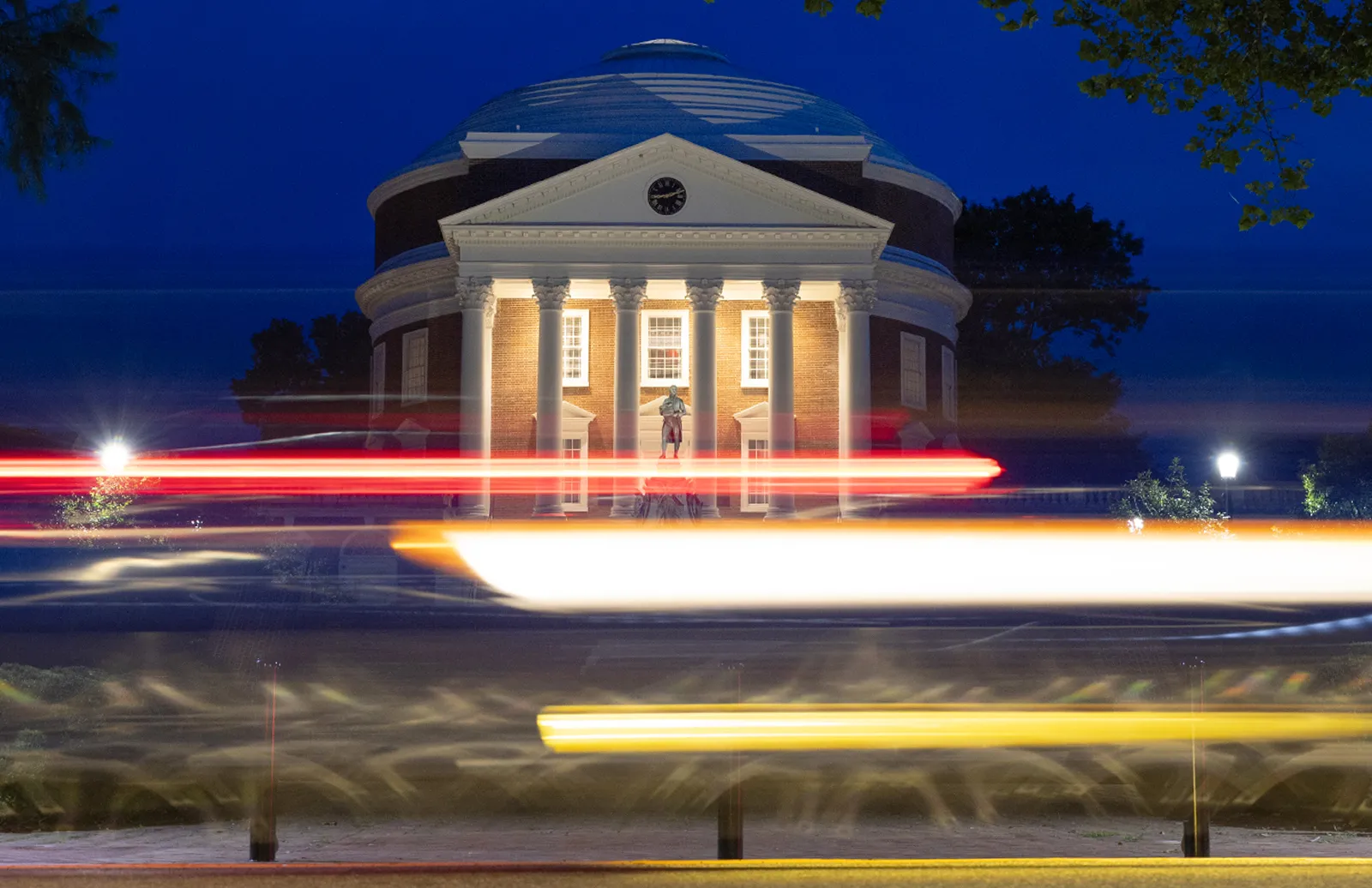 The historic Rotunda at the University of Virginia lit up at night as car streak by on University Avenue.