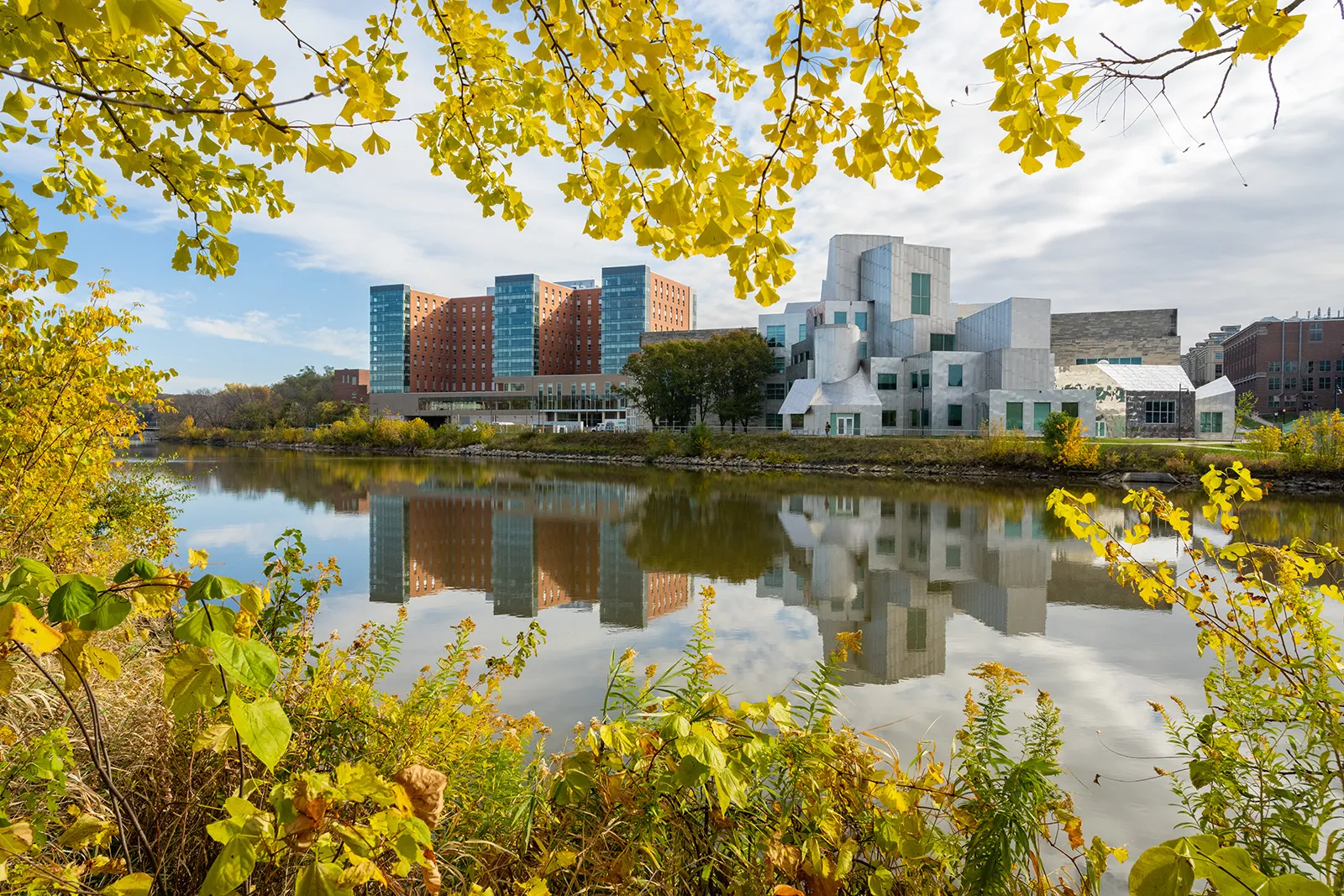 The sun creates warm mirroring reflections as it rises in the morning.
