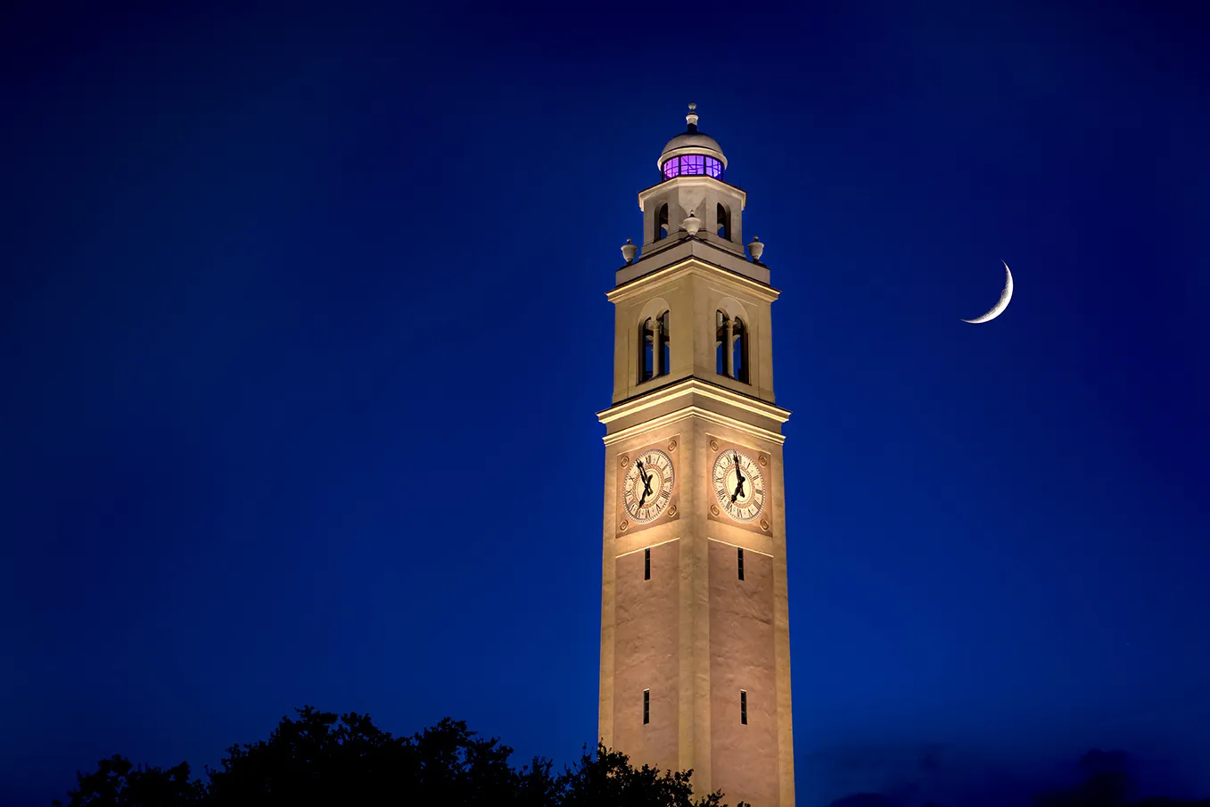 Memorial Tower is lit up at night after a multi year renovation.