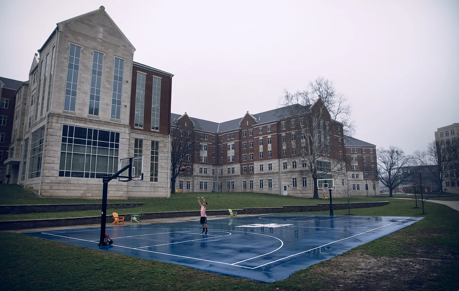 A student took to a rainy basketball court all by himself as students came back to campus to clear their dorm rooms after Spring Break.