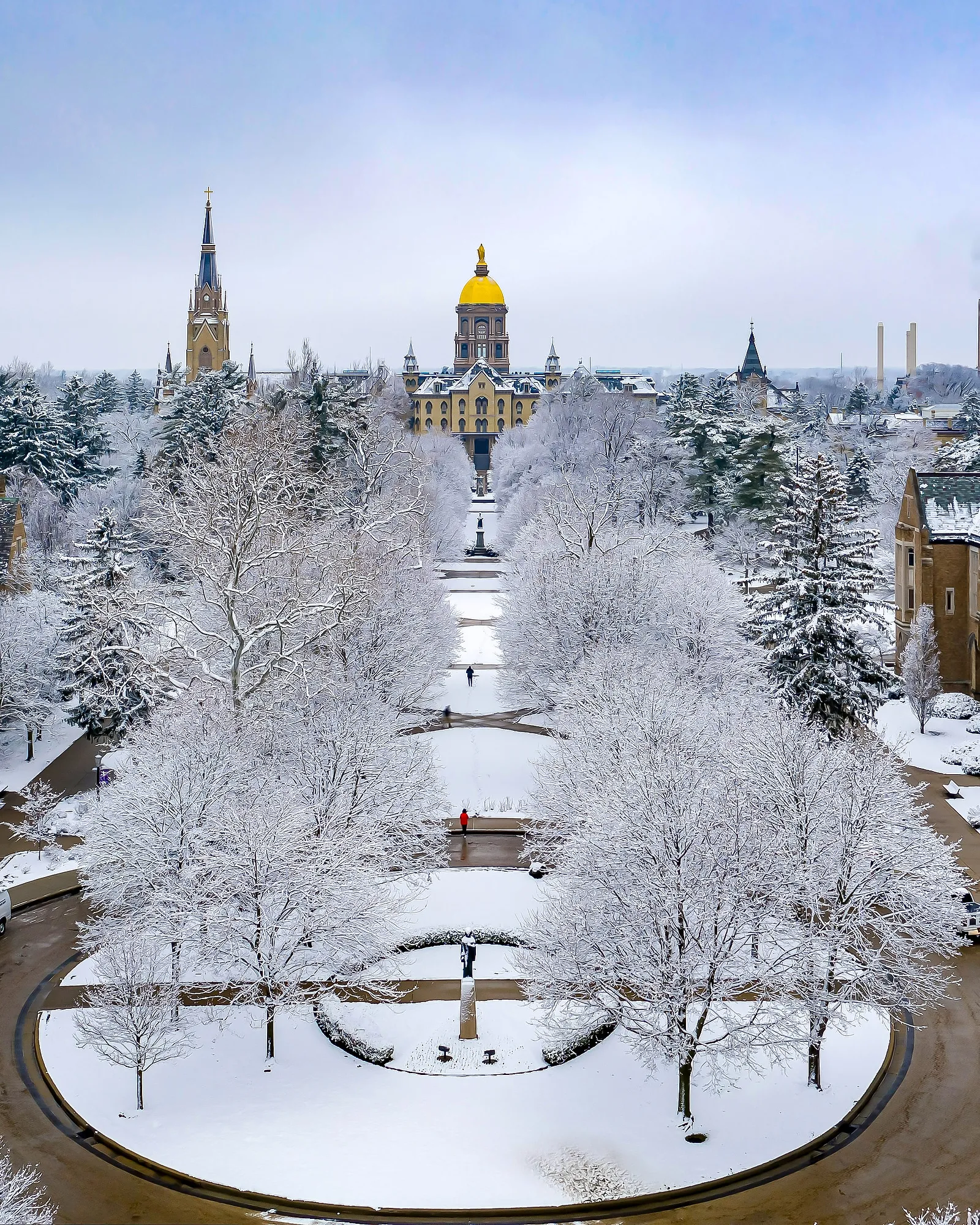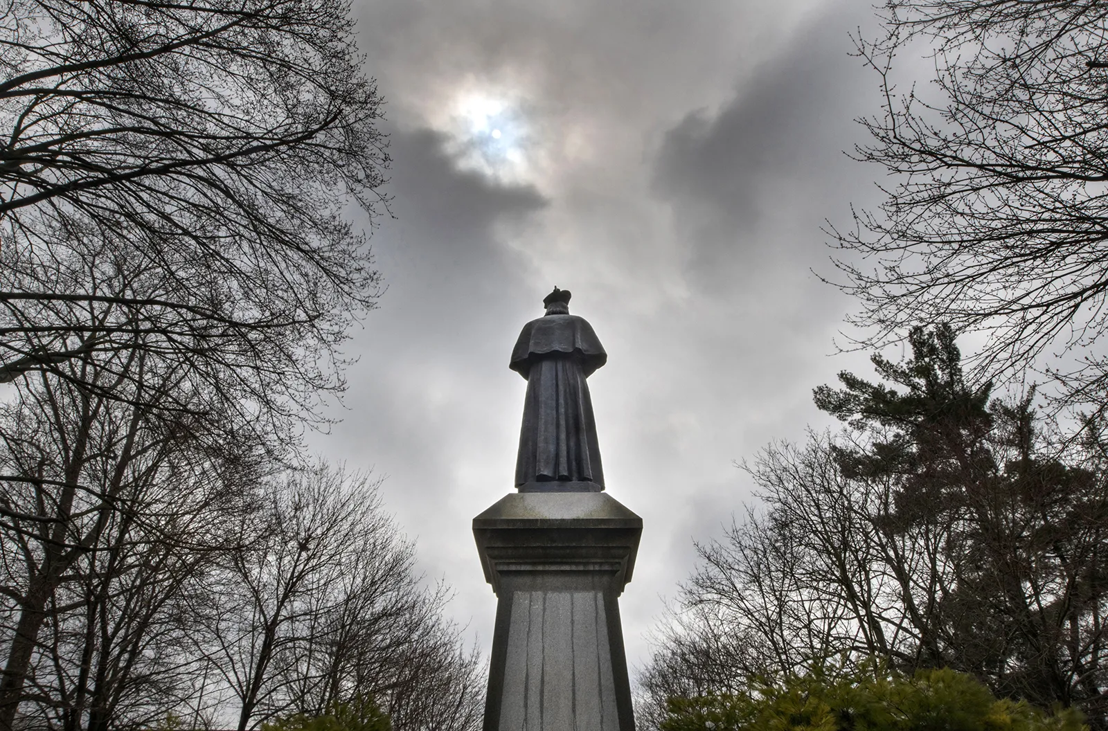 The sun breaks through the clouds over the Fr. Sorin Statue on the Main Quad.