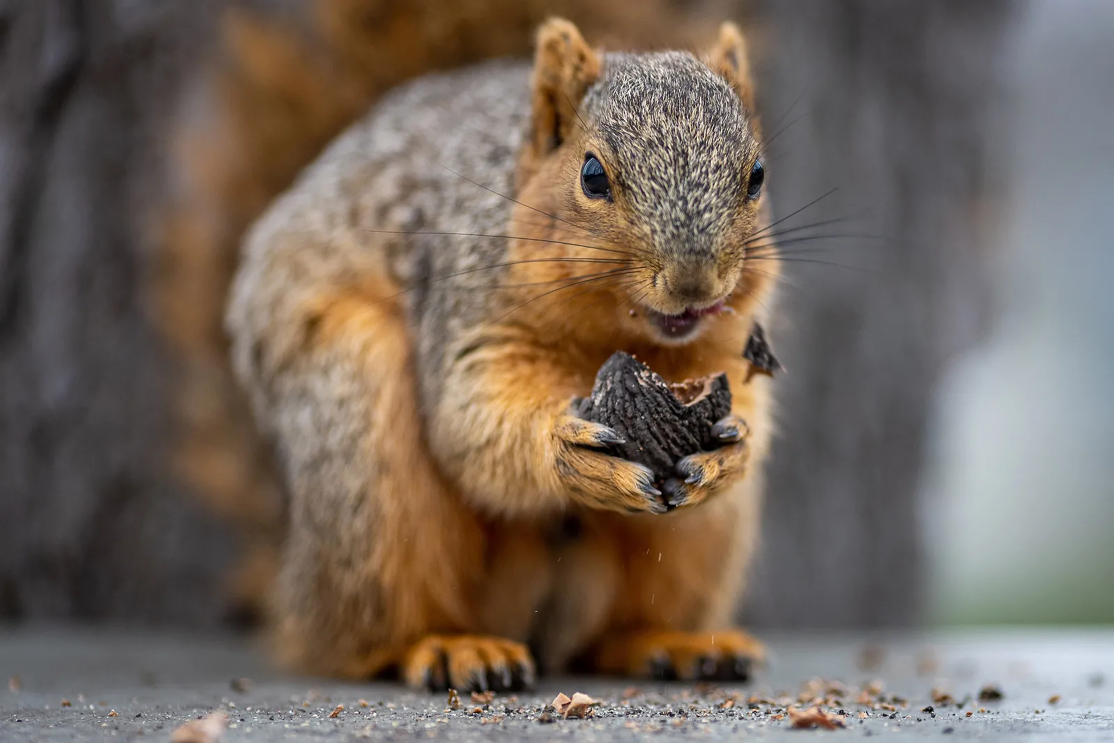 A squirrel, suddenly on a campus without the usual handouts from students and visitors, returns to it's usual meal of black walnuts.
