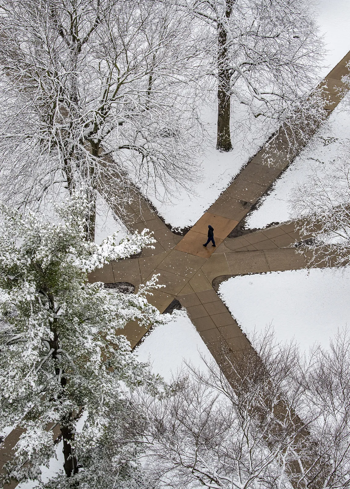 A student walks through a courtyard on campus after a snowfall in early spring.
