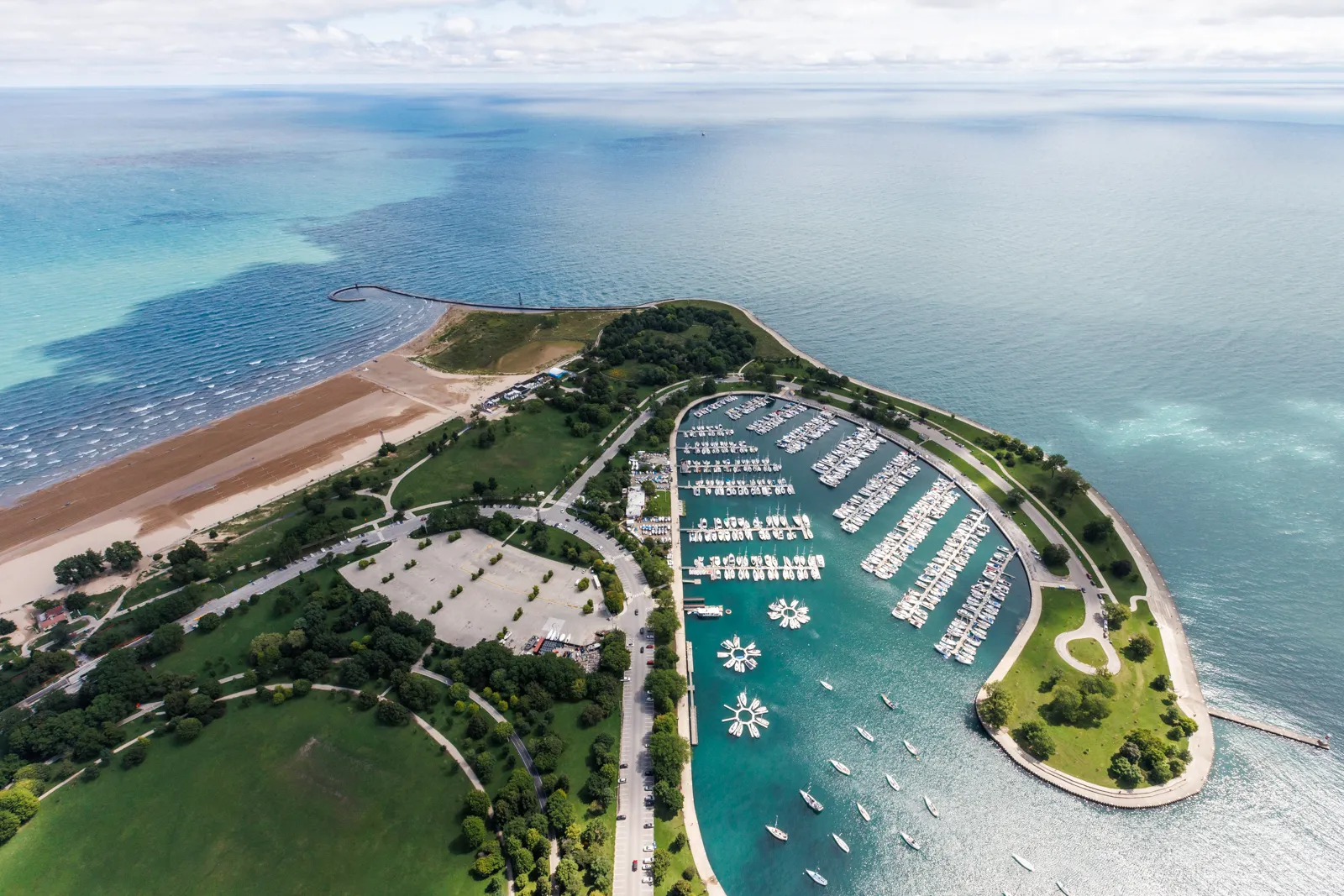 Montrose Harbor in Chicago, IL seen from a helicopter on August 20, 2025. This photo was made as a stock image to promote our campus and the surrounding city.