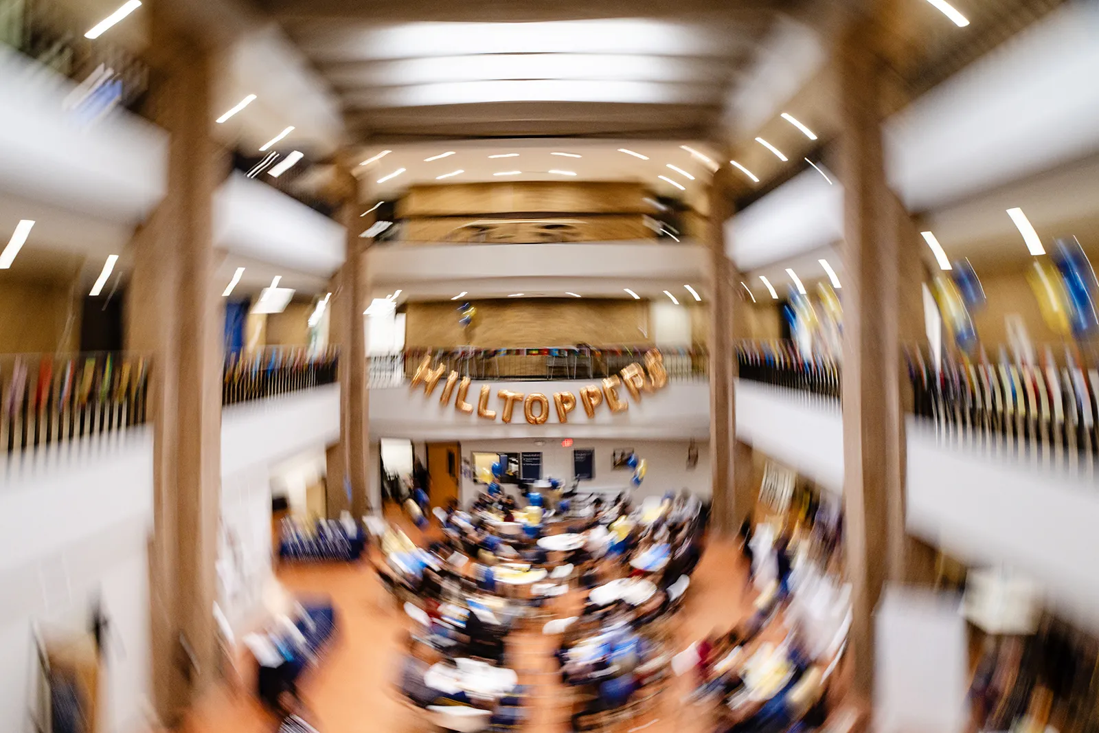 The O on a Hilltoppers balloon display remains sharp while the rest of the letters and the scene are blurred due to an in-camera motion blur effect from slow shutter during an exposure taken at a first generation student reception at Moody Hall in Austin, Texas, on Saturday, August 23, 2025.