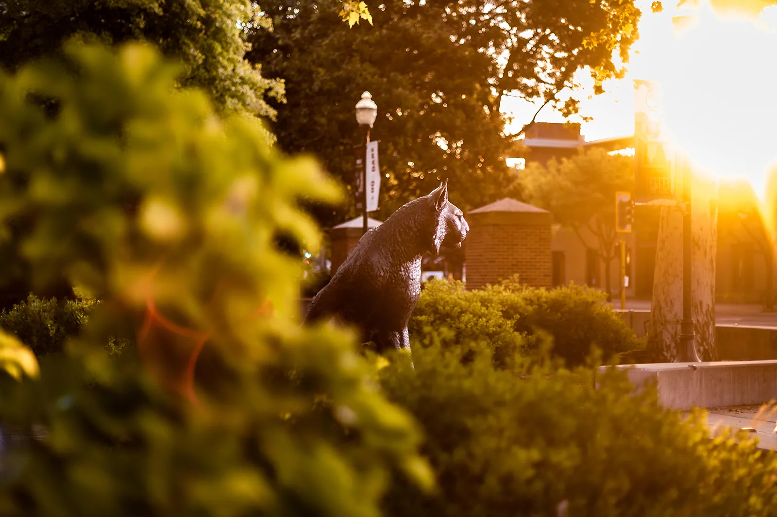The sun shines on the bronze Wildcat Statue, located in front of the Bell Memorial Union on Friday, August 29, 2025. The statue depicts Lynx rufus californicus, the native bobcat, in a natural environment as a symbol to promote school spirit characterized by respect, confidence, and commitment.