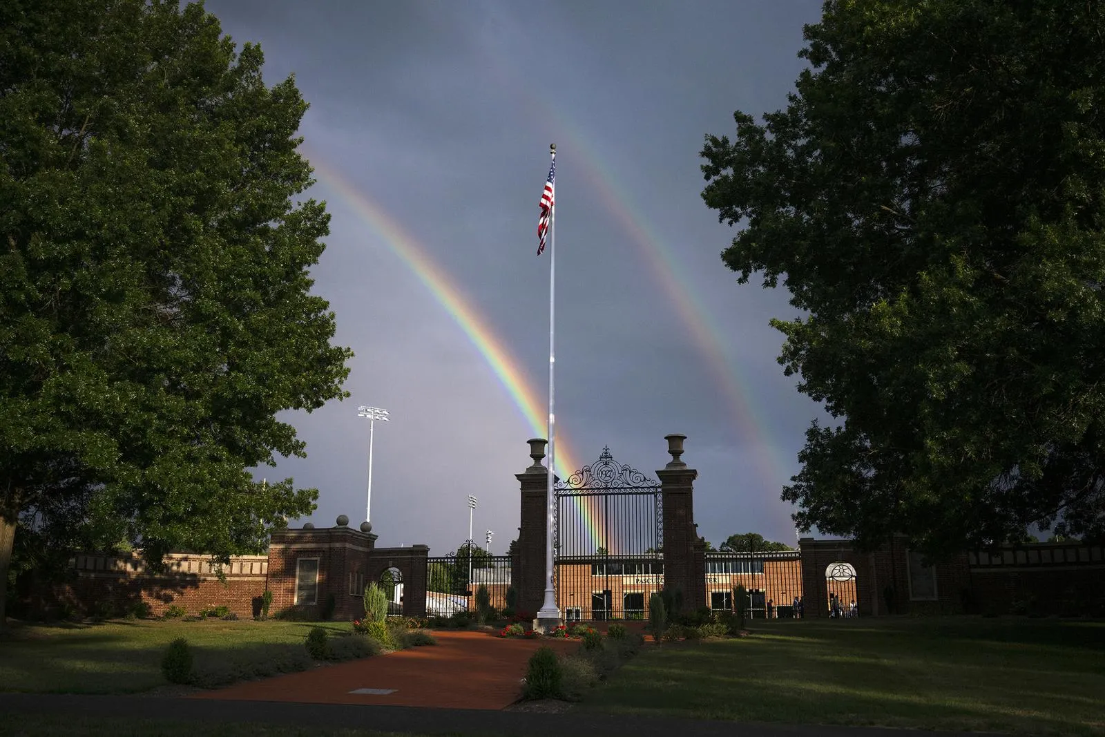 Double rainbow pictured behind Christy Mathewson Gates in late August.