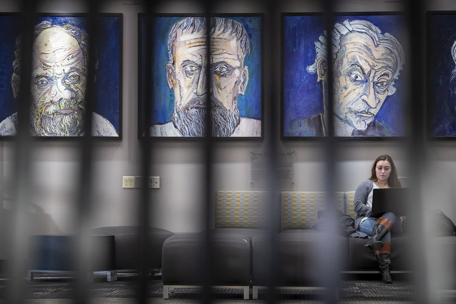 Student Lexie Wasinger studies in the Hesburgh Library.