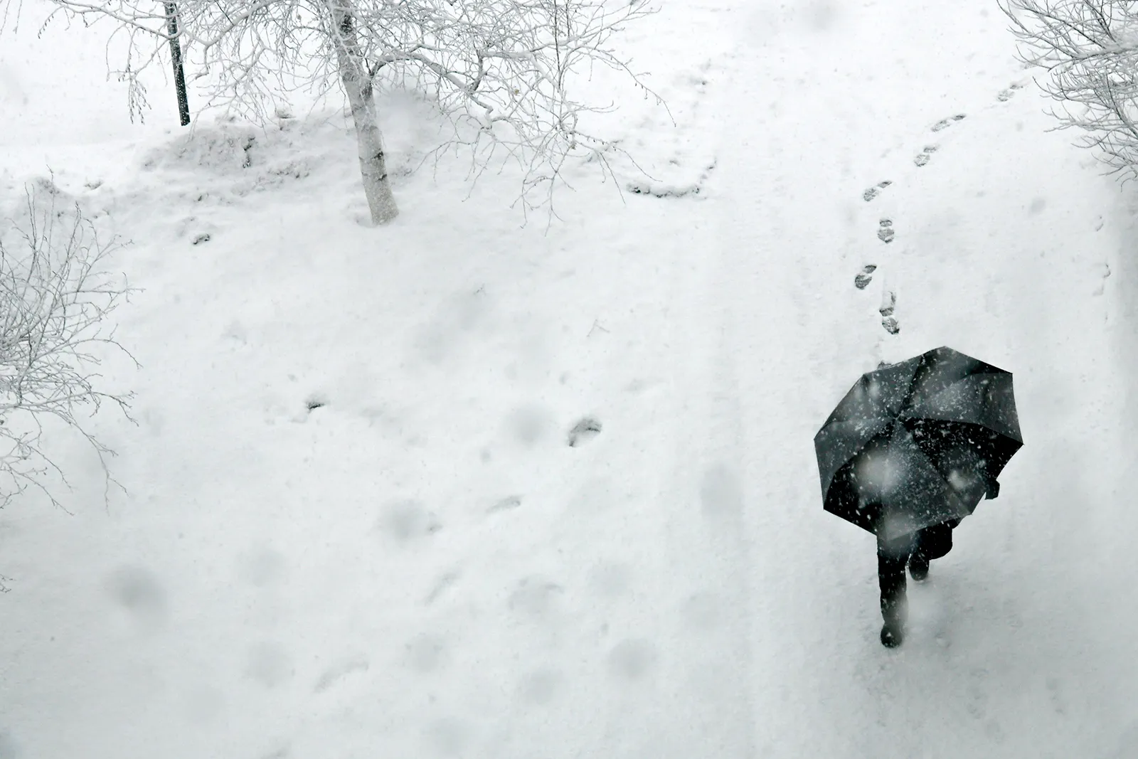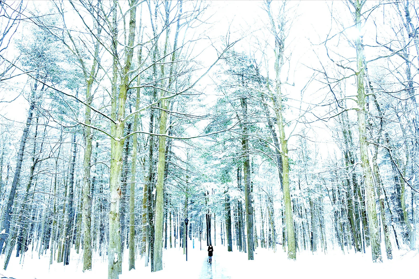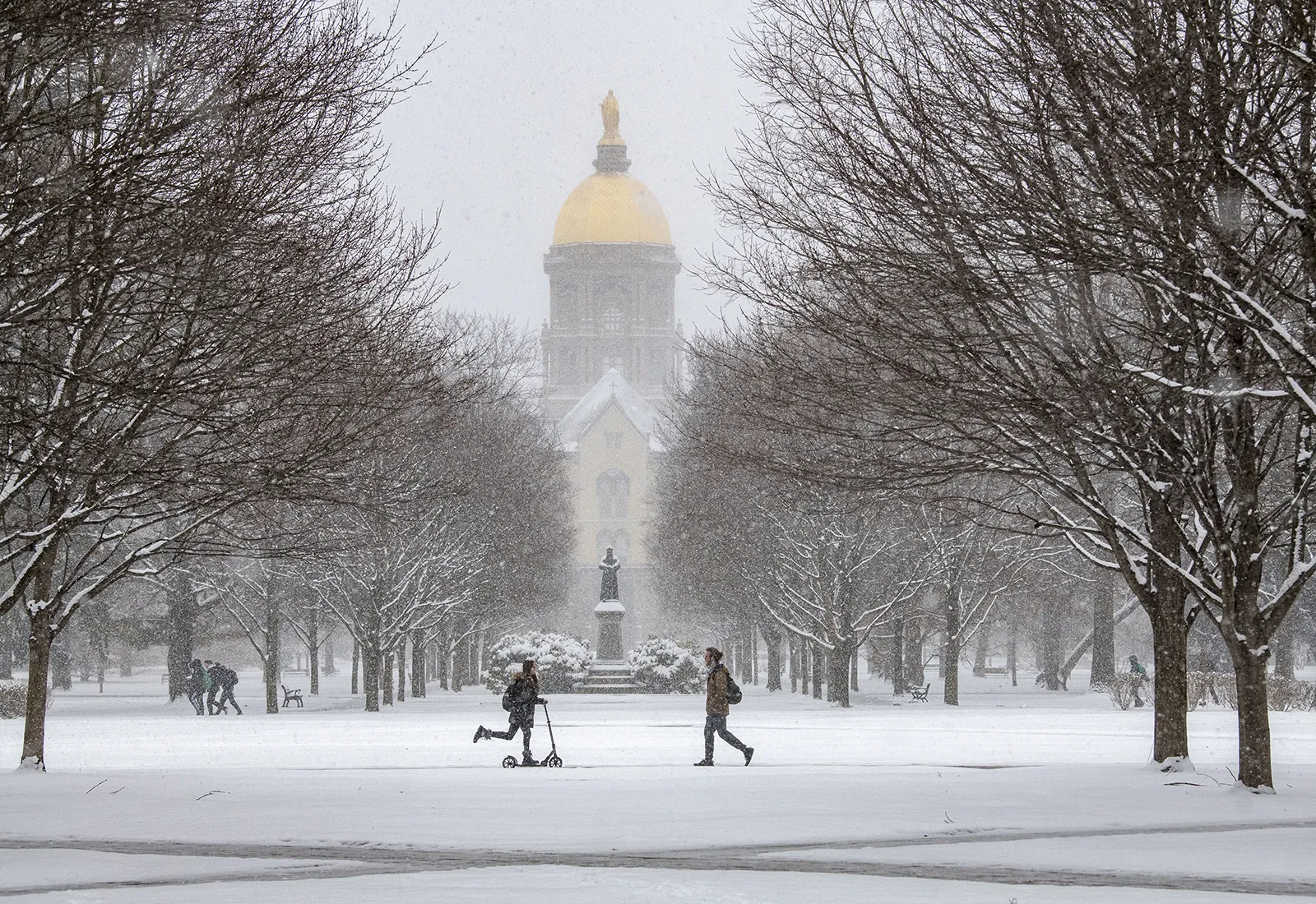 A student walks through the New York snowstorm on his way to class on the Clarkson University campus, February 2020.