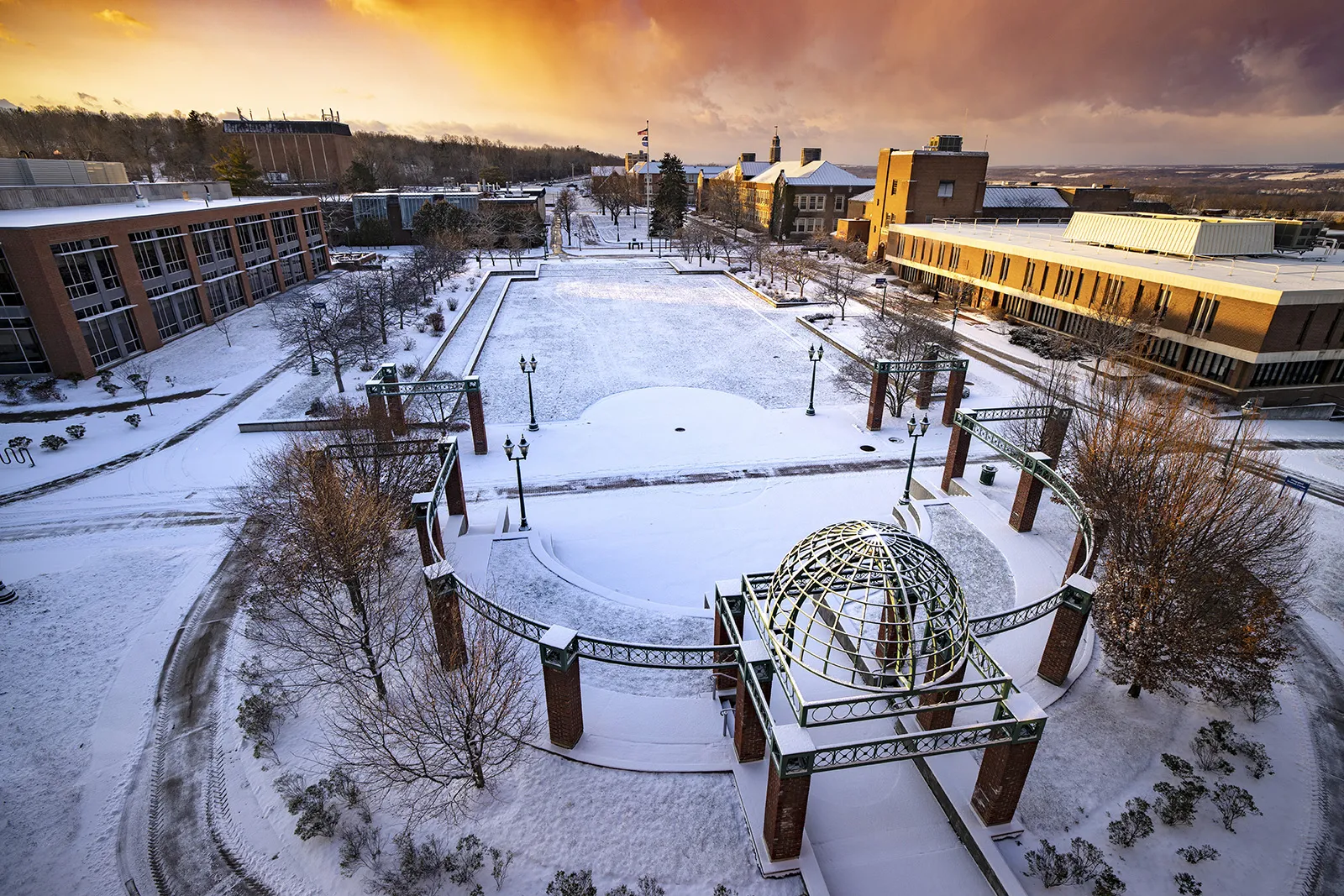 A quiet moment on a usually bustling campus as a blanket of snow lies undisturbed until the grounds crew ruins it!