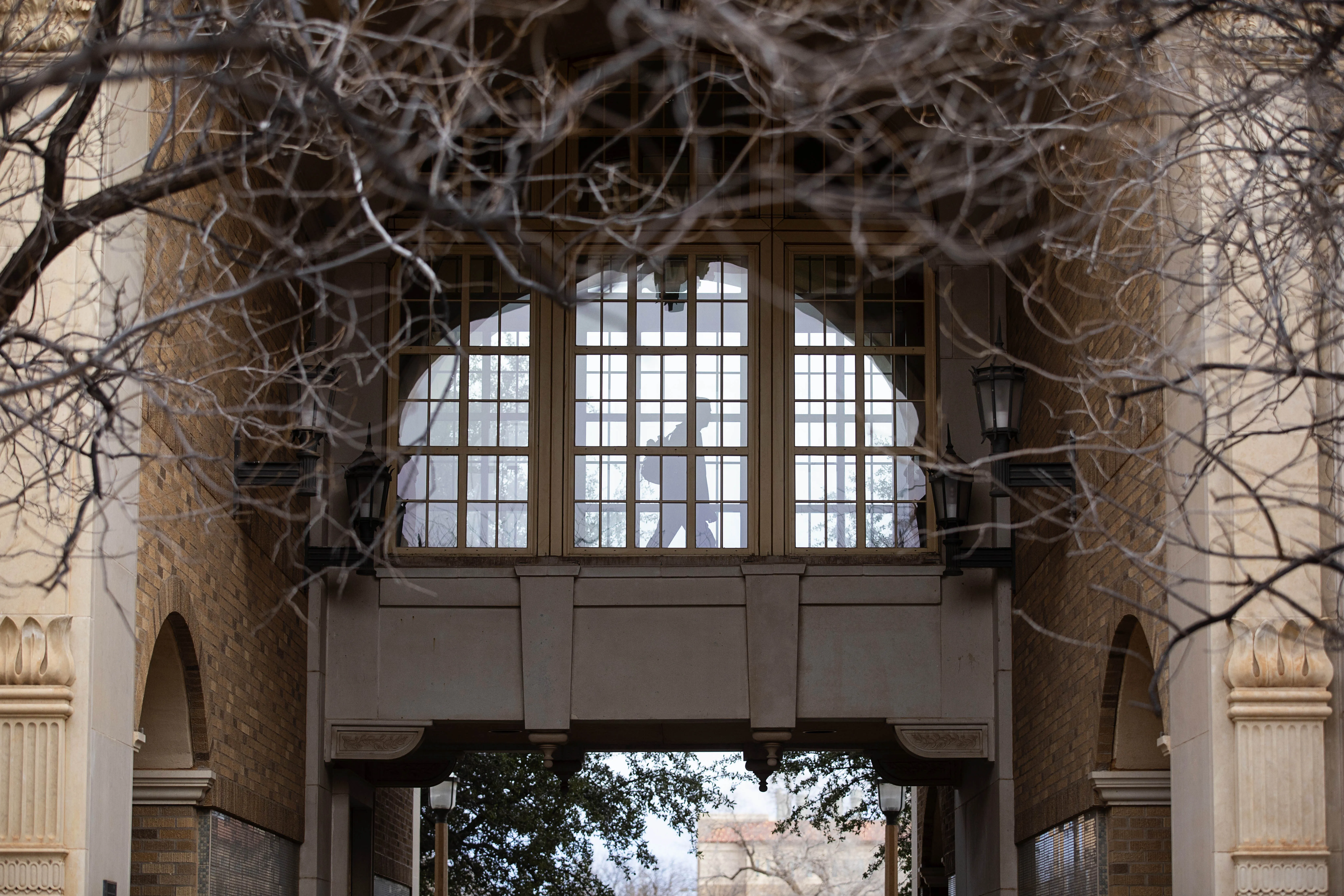 Texas Tech student passes through a windowed walkway between the English and Philosophy buildings on the first day of classes for the Spring semester.
