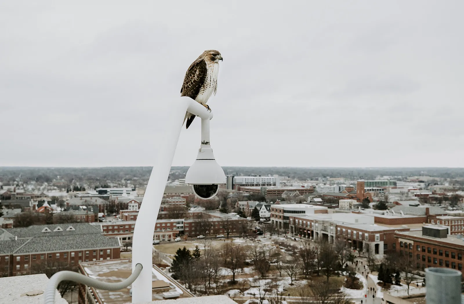 A hawk looks over campus while perched on a security camera bracket on the roof of the tallest building on campus. It wasn't fazed by four of us on the roof for a photo shoot and never flew away the entire time.