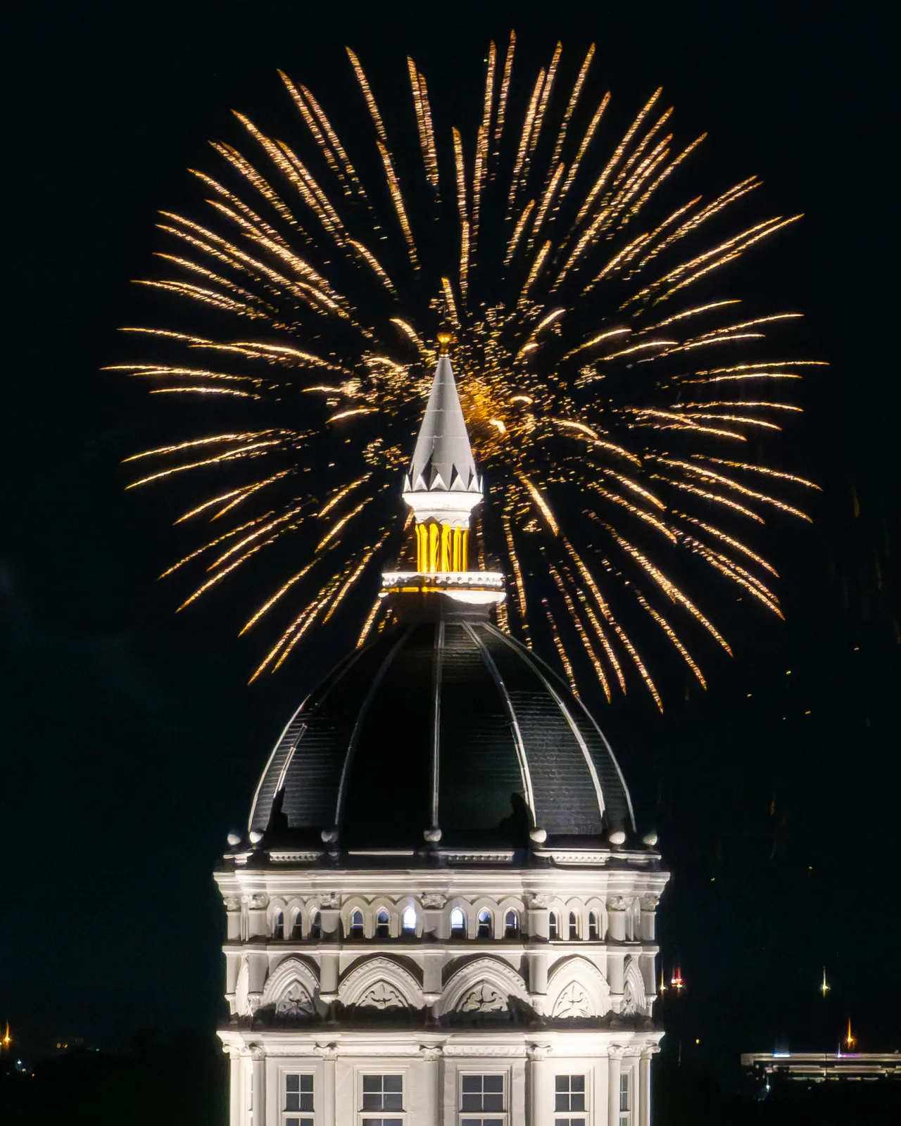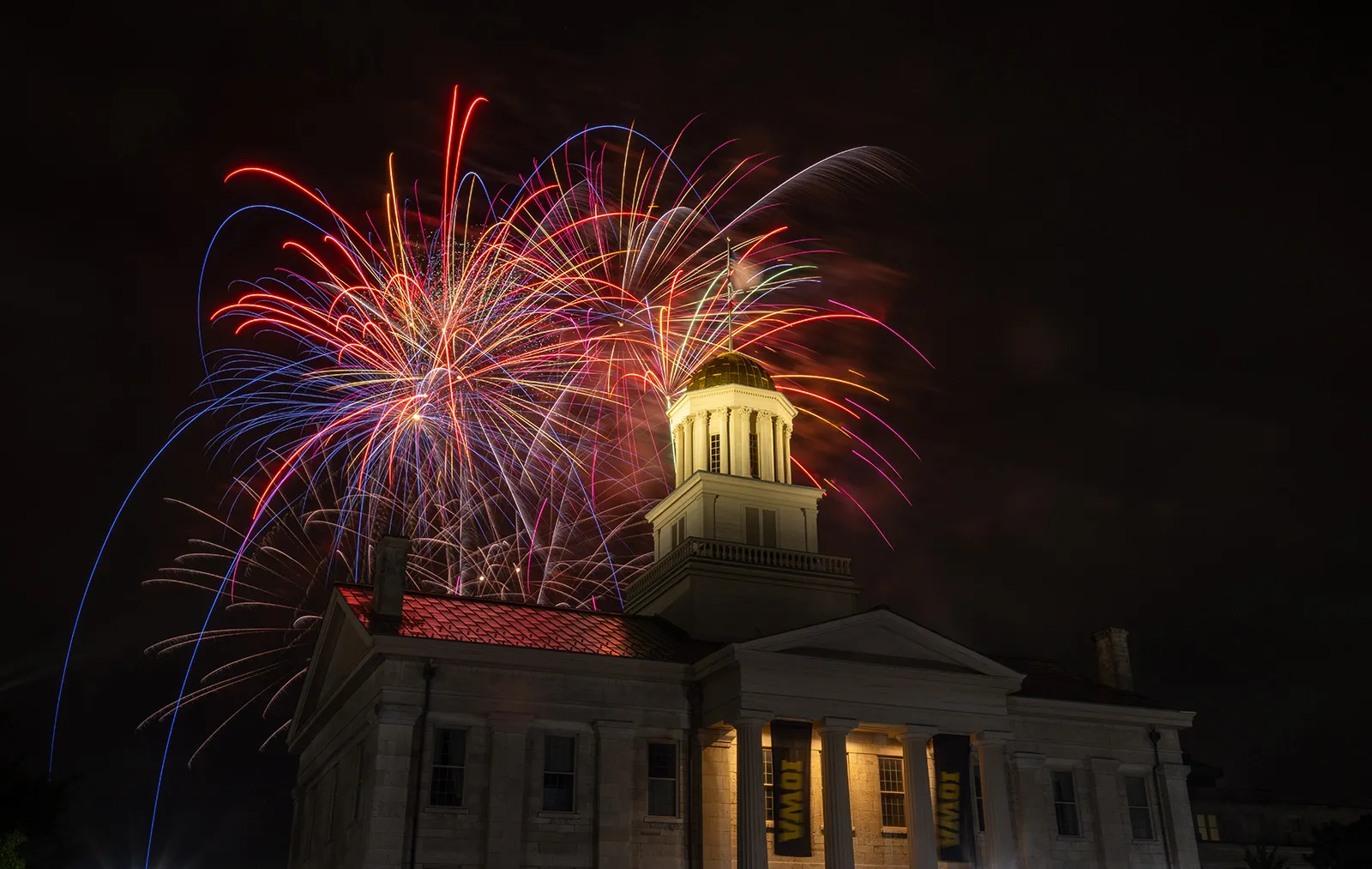 The annual Fourth of July fireworks display lights up the sky behind the Old Capitol.