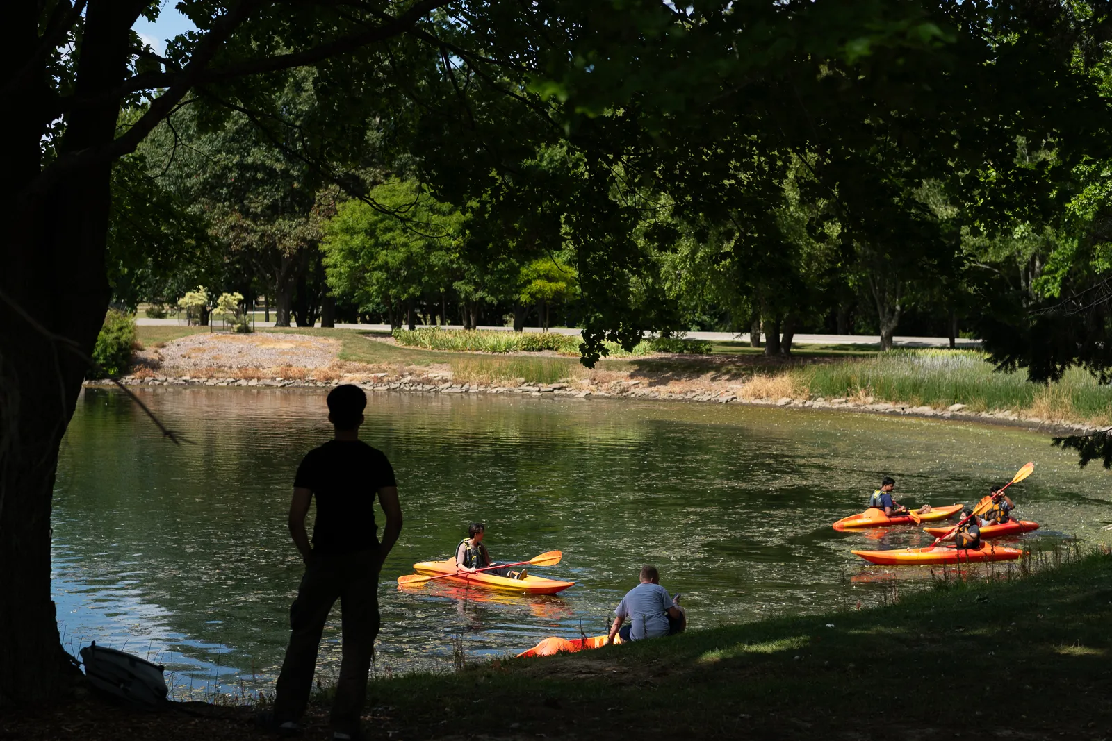A student waits his turn for a boat during a Welcome Week event at the pond on campus.