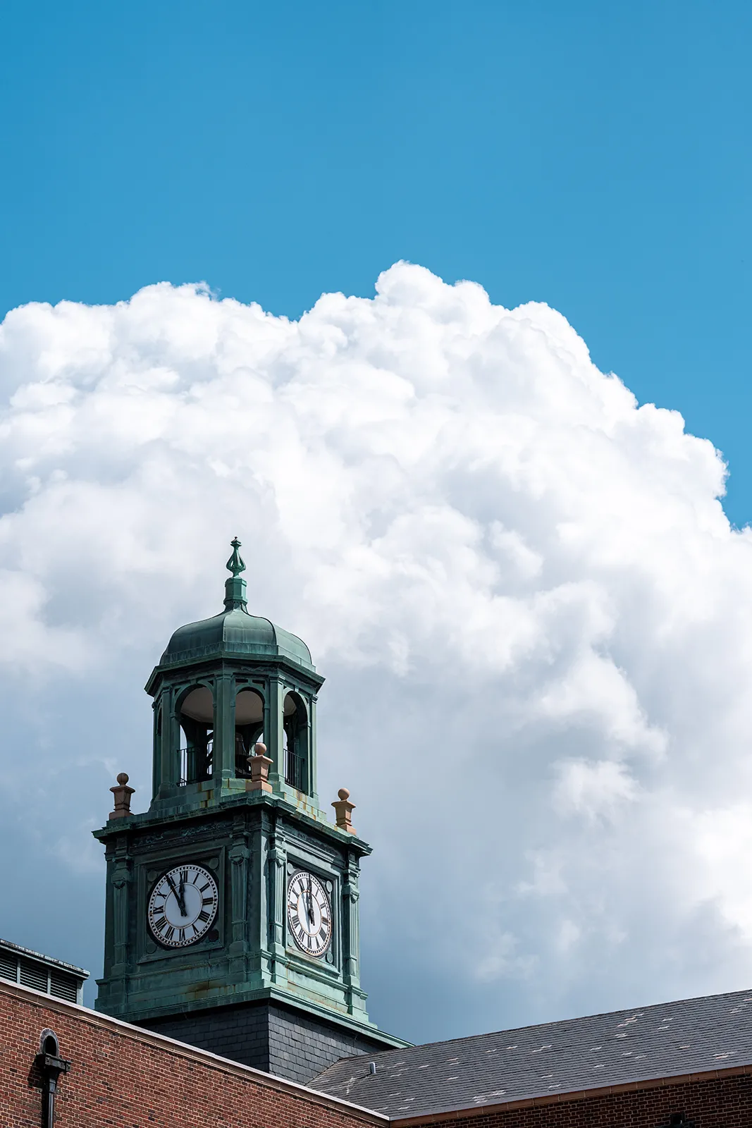A giant puffy clouds encircles the iconic Stephens hall on Towson's campus.