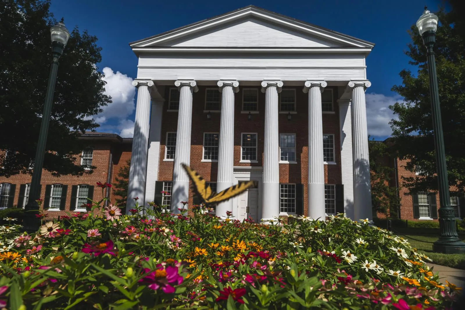 A butterfly enjoys the pollinator garden in front of the historic Lyceum building on the Ole Miss campus.