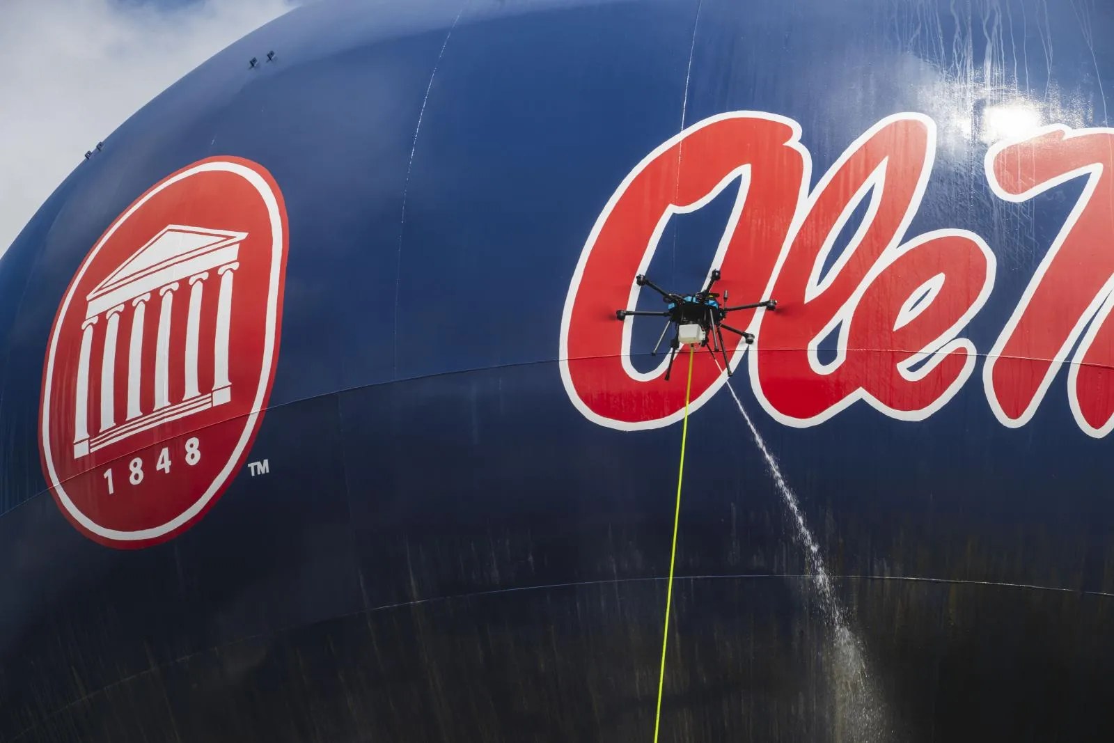 A drone flown by the university's Facilities Management team uses a high-pressure hose to clean pollen from the iconic Ole Miss water tower ahead of football season.