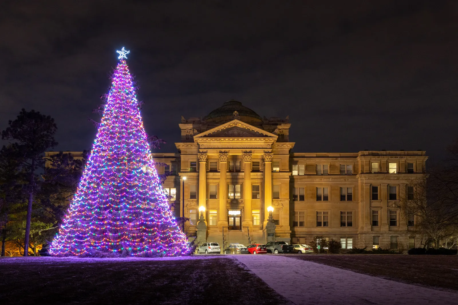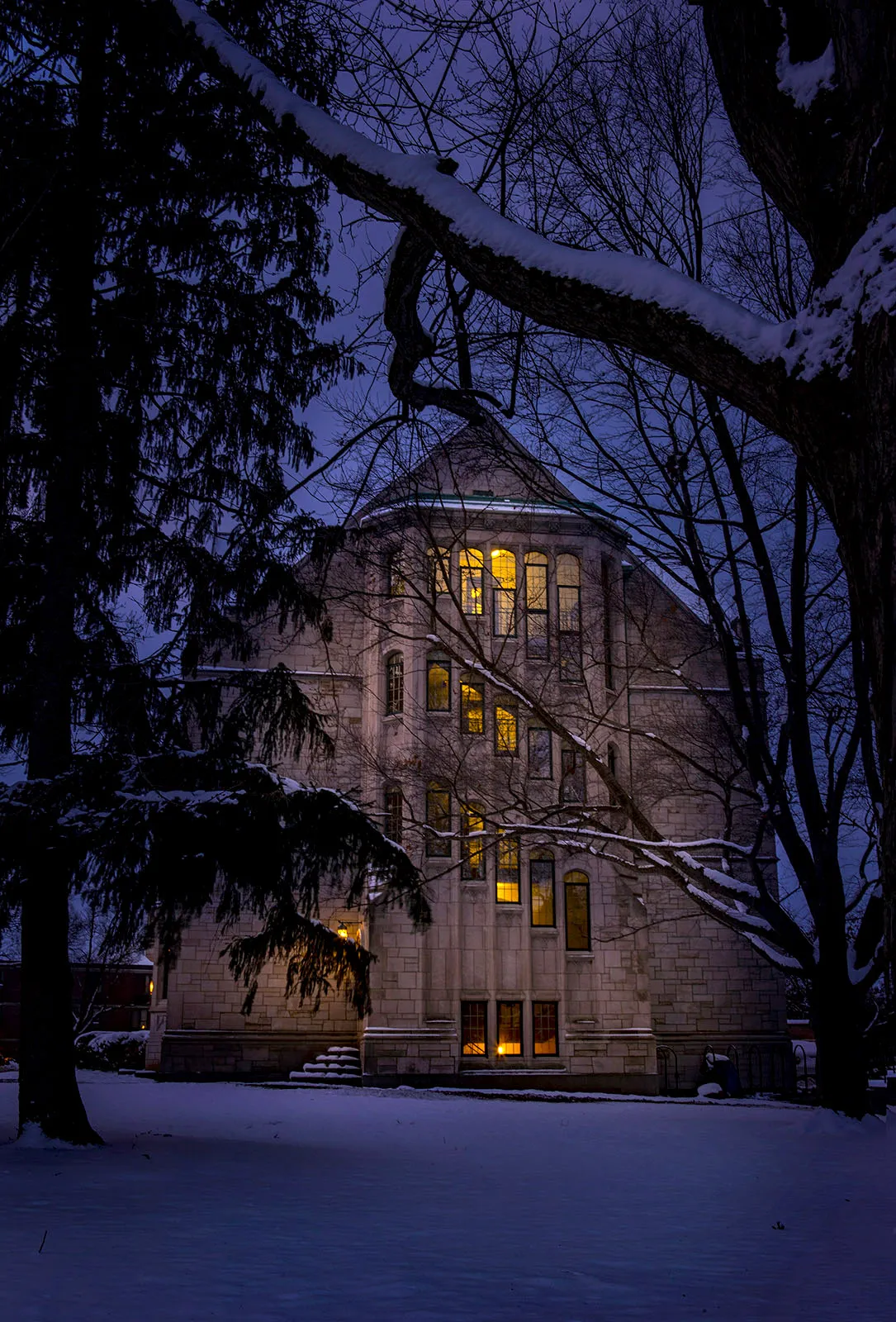 Our oldest residence hall throws a welcoming light on a cold, December evening.