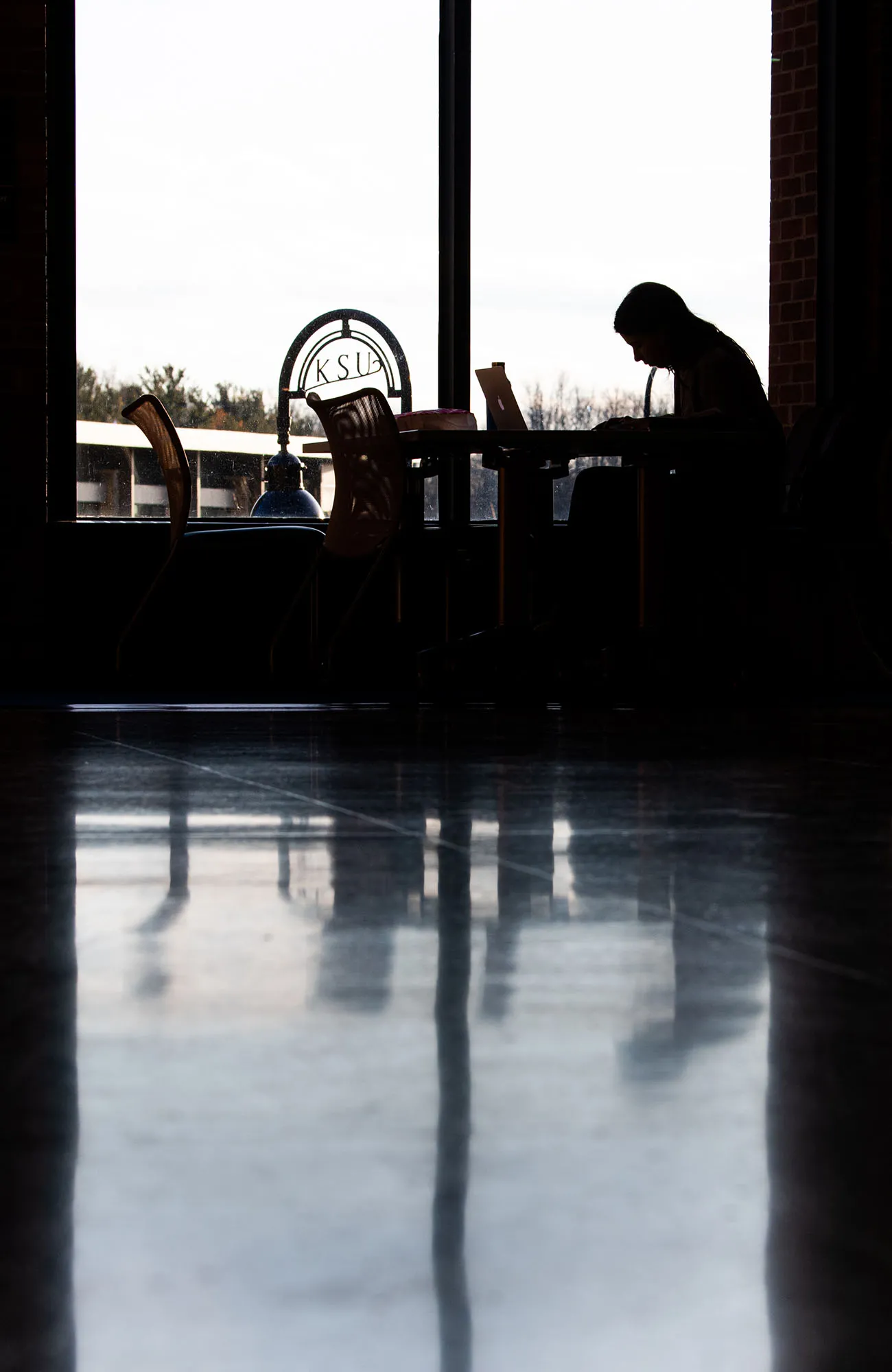 A student studies on the second floor of the student center during finals week.
