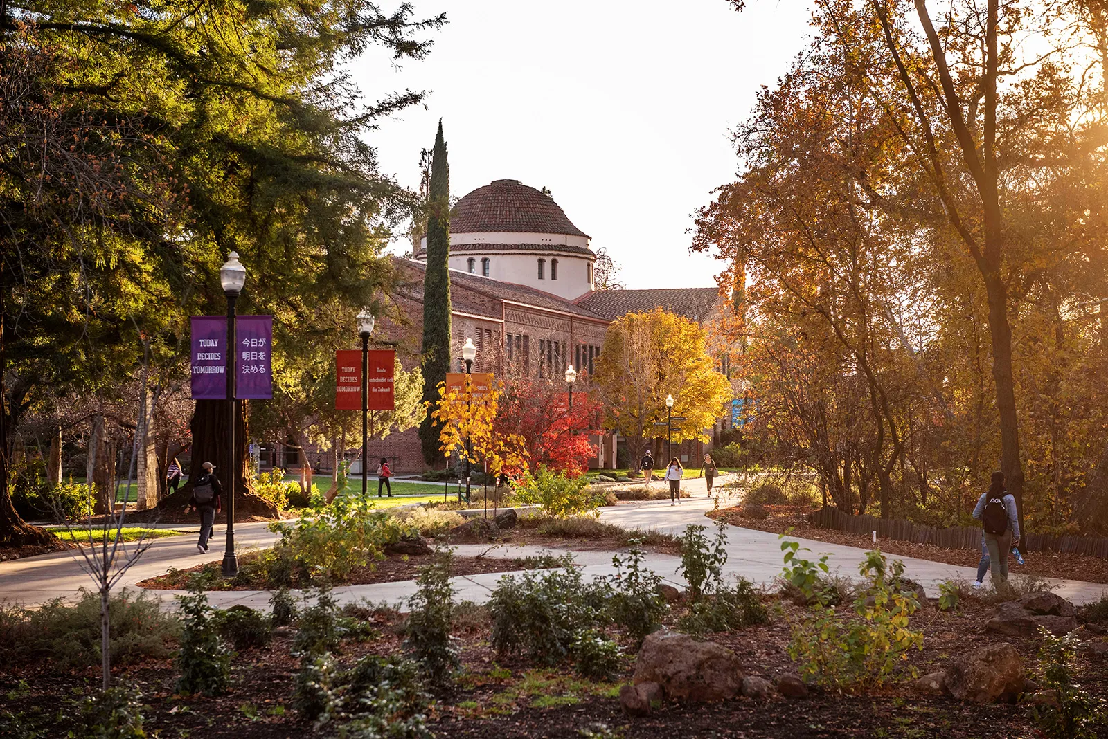 The gold bridge is illuminated by the sun while a student walks through campus.