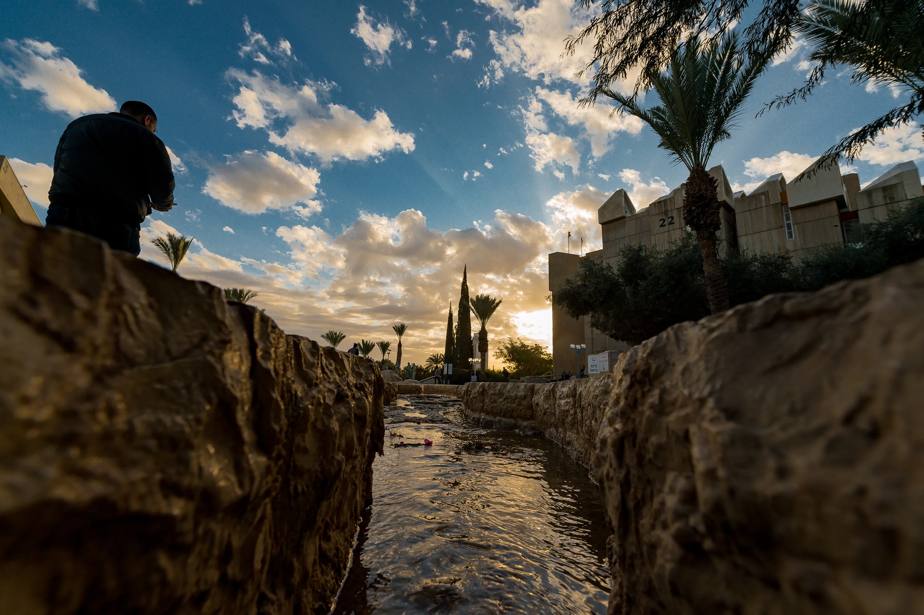 Low and wide perspective of the stream that runs through the main campus plaza
