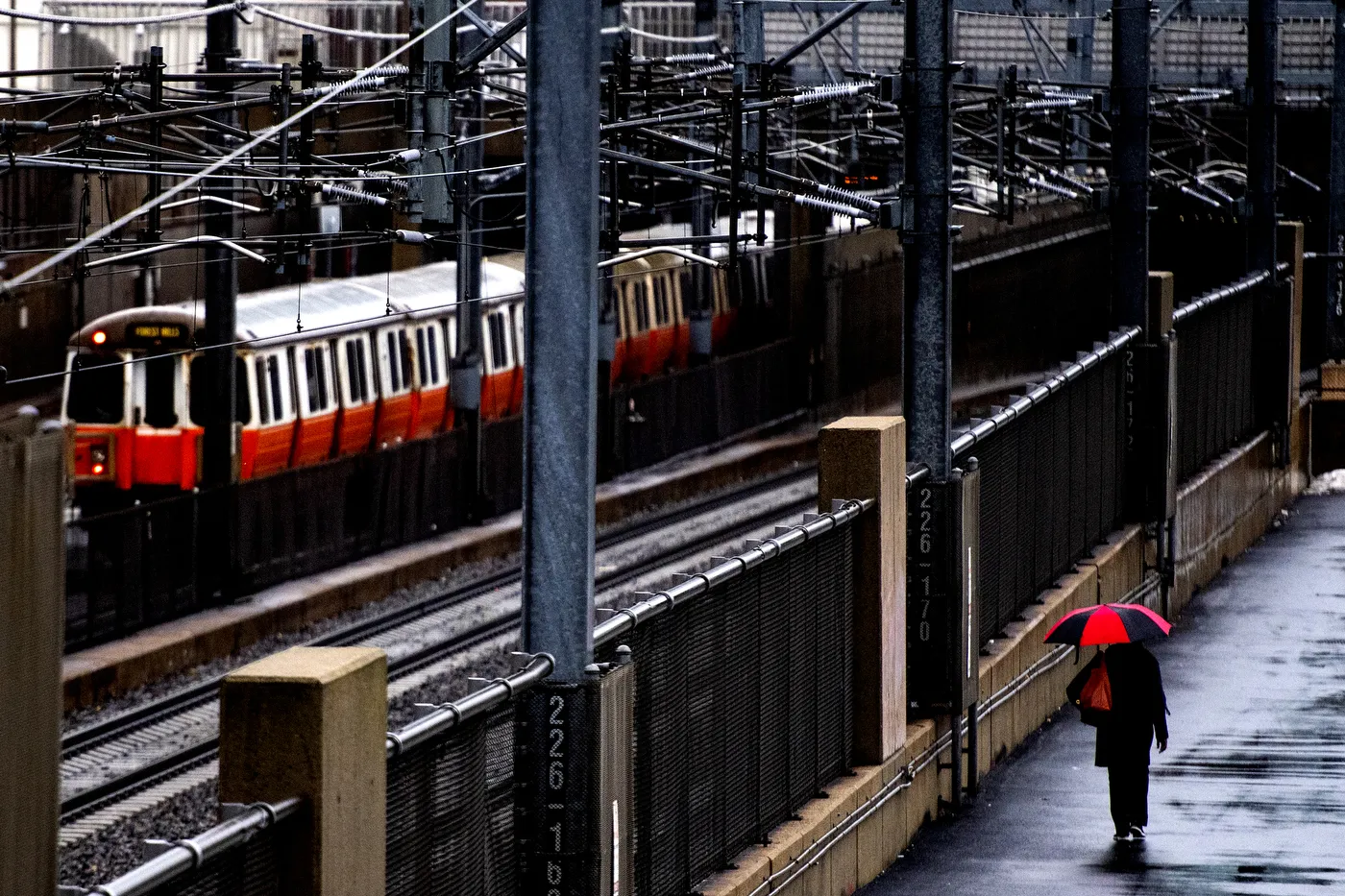 A person walks alongside the William E. Carter Playground as the MBTA Orange Line train passes.