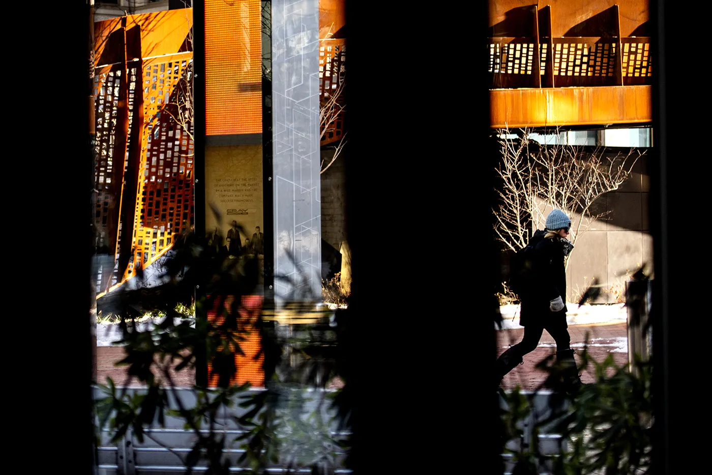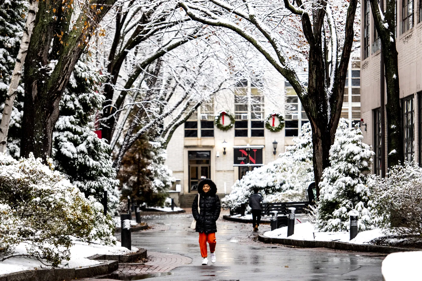 A student walks through a winter wonderland on campus after a light snowfall.