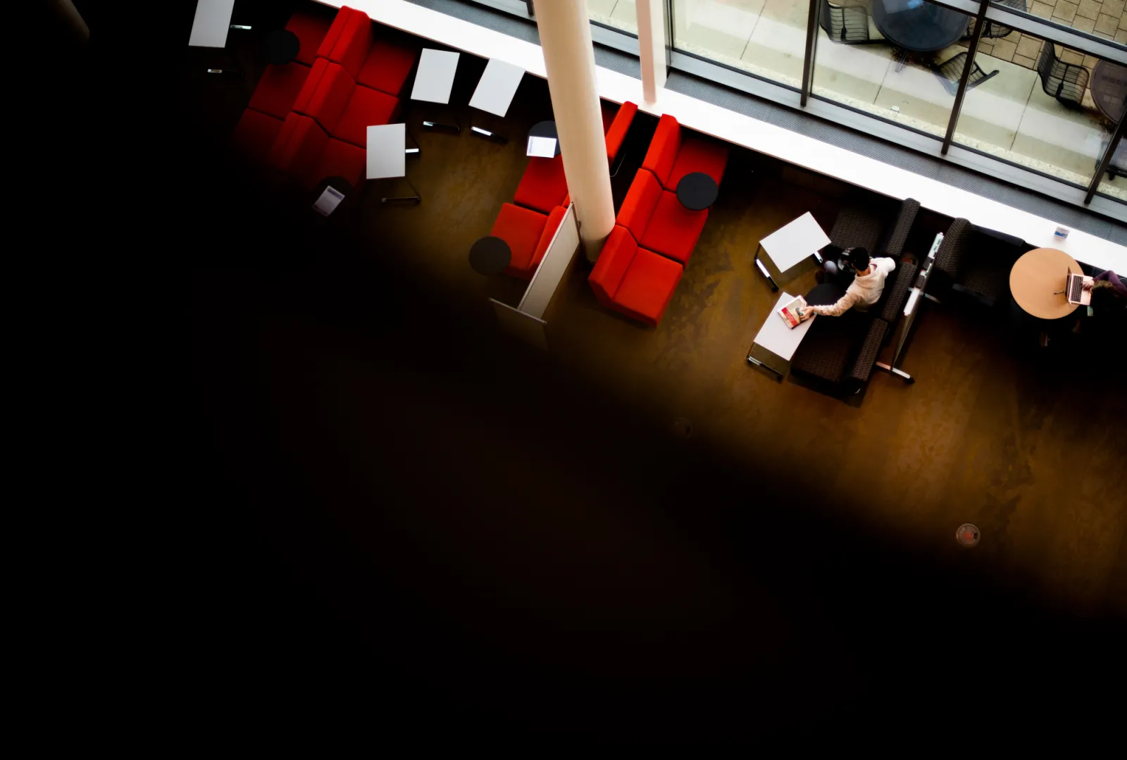 A student settles in for a study session at Grand Valley State Unversity's Mary Idema Pew Library.