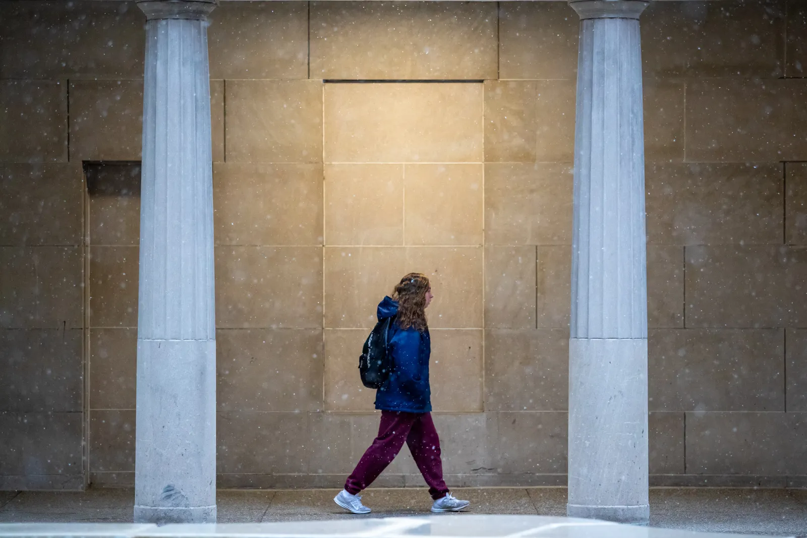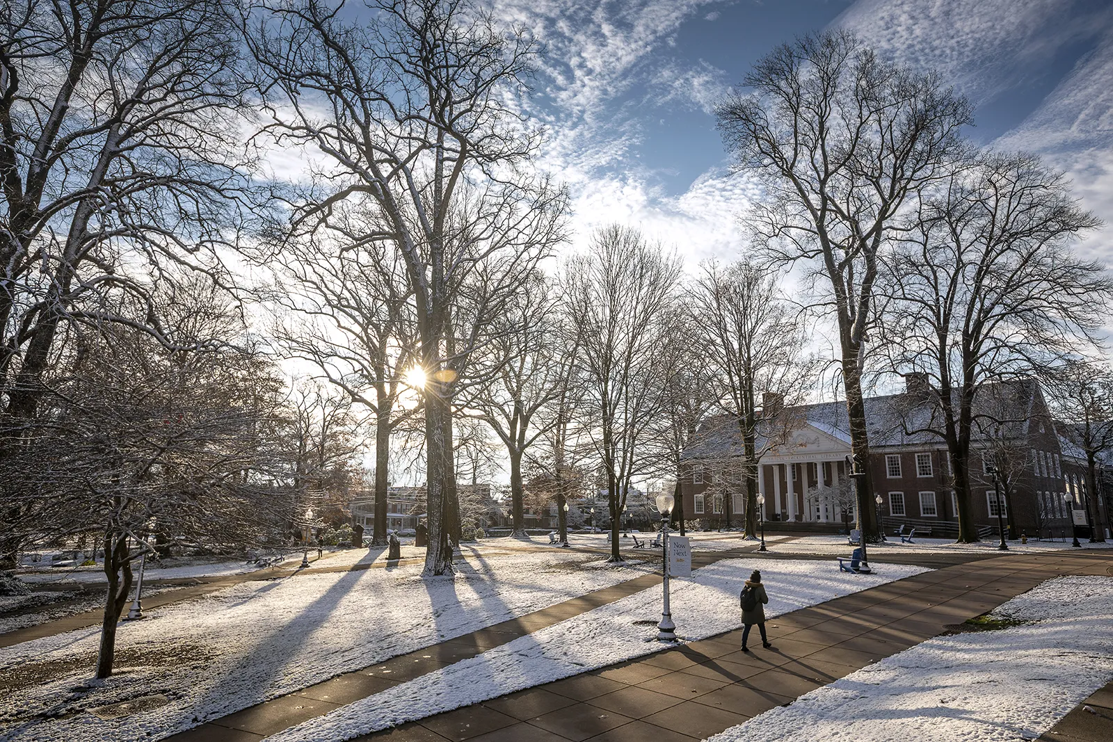 A night of light snow gives way to a bright brilliant morning during finals week.