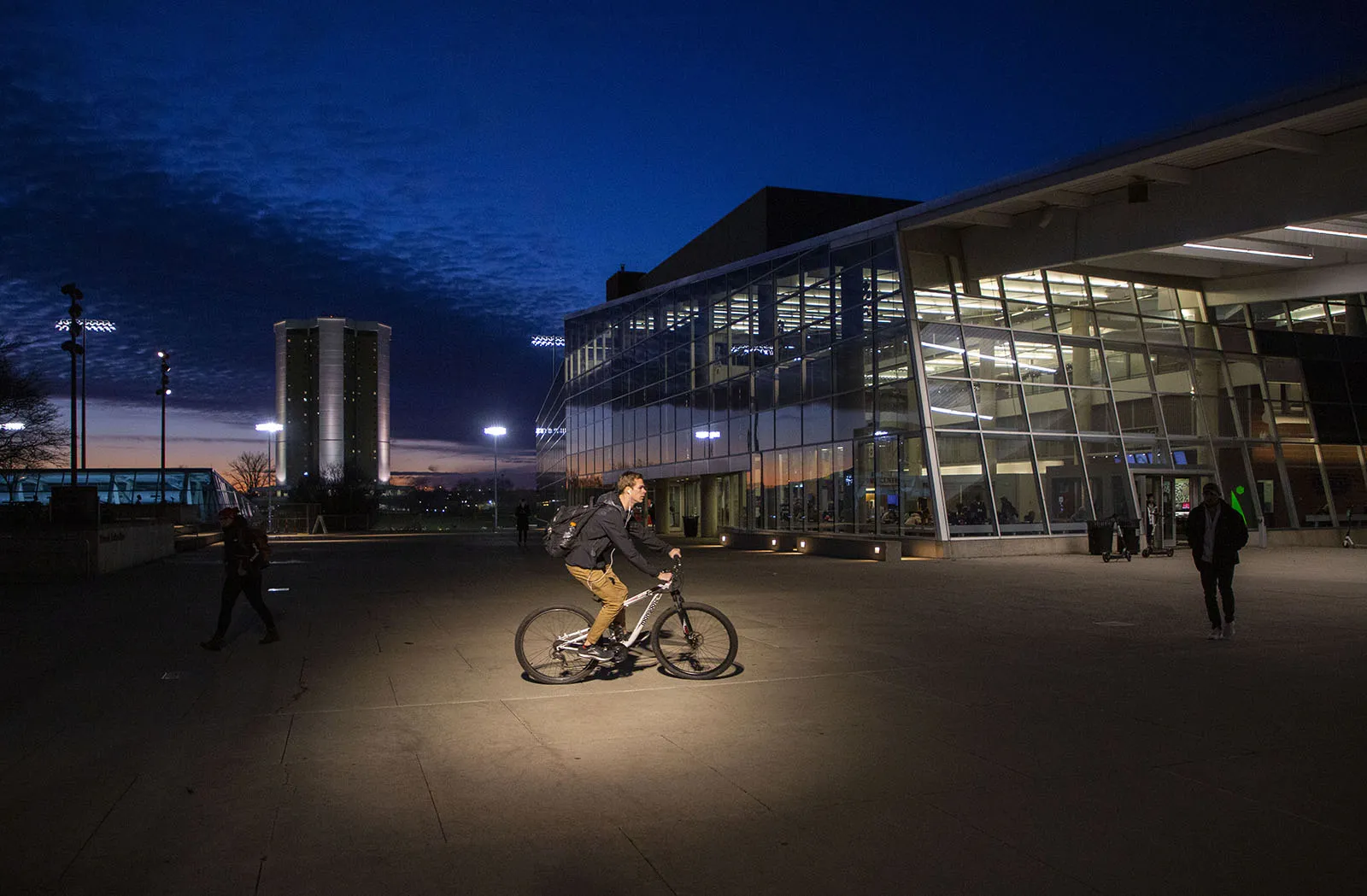 A cyclist passes through a flood light illuminating a walkway on campus during the last evening before final exams.