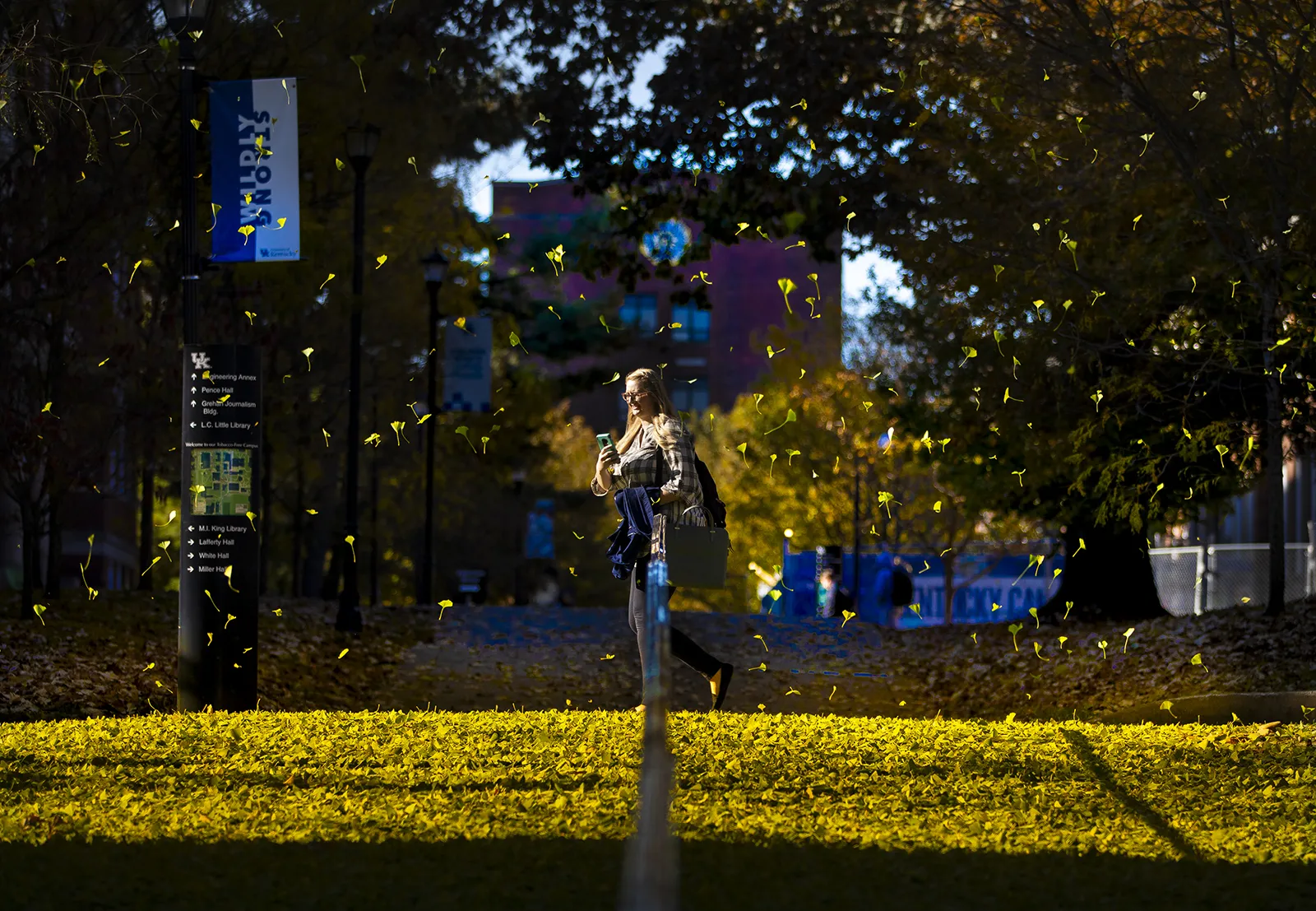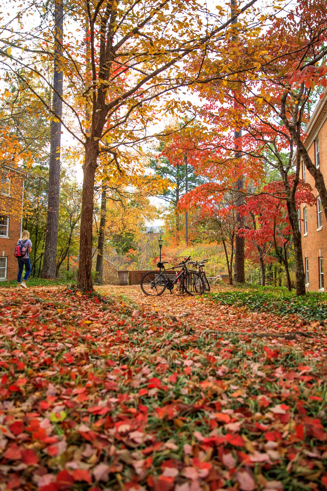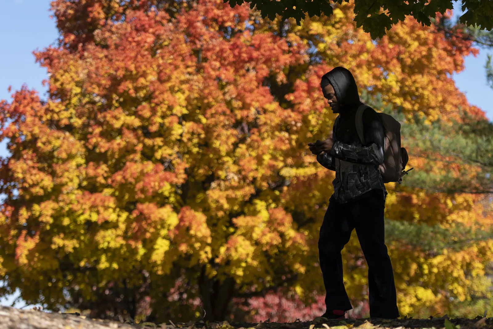 A student makes his way to class as the campus shows off its fall wardrobe.