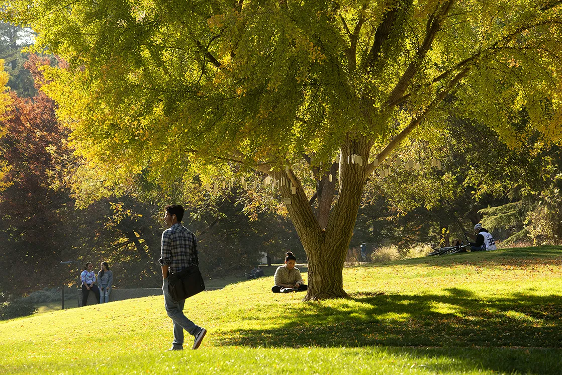 Students enjoy the sun and warmth under the gold and yellow autumn leaves in the Arboretum