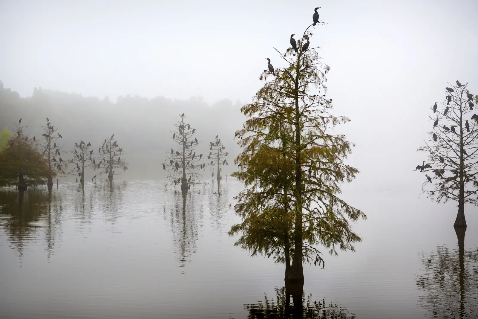 An eerie view of Bald Cypress trees in University Lake on a foggy morning.