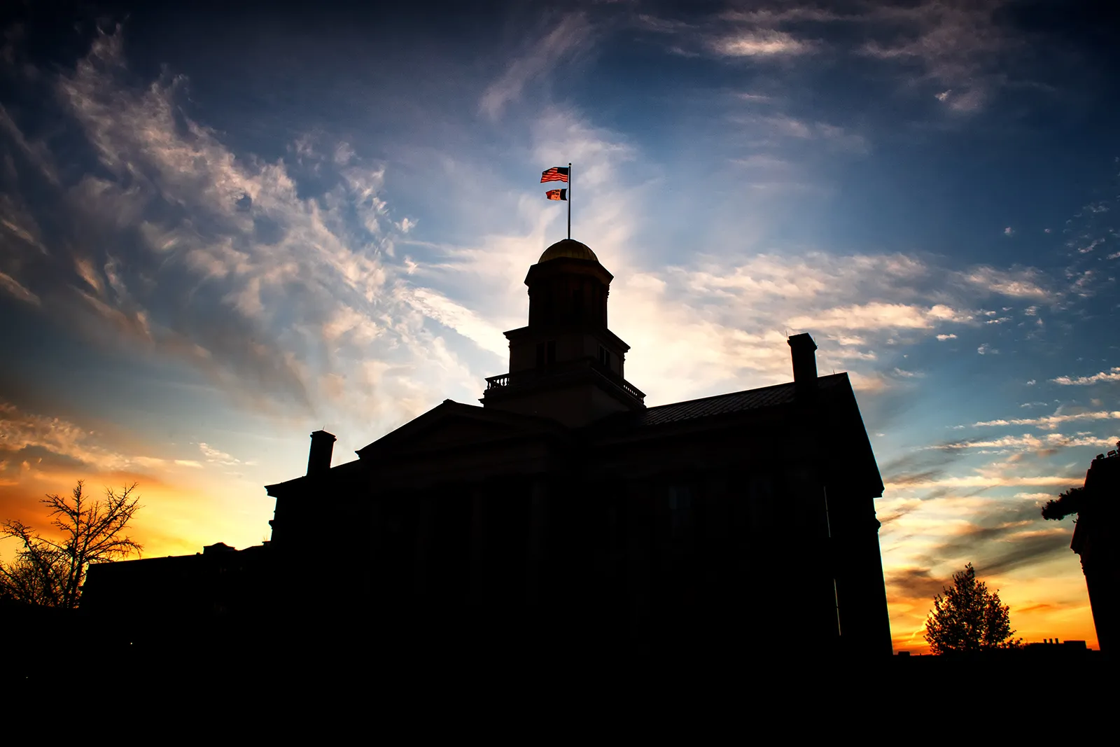 Silhouette of the Old Capitol Building framed by the sunset on November 25, 2019
