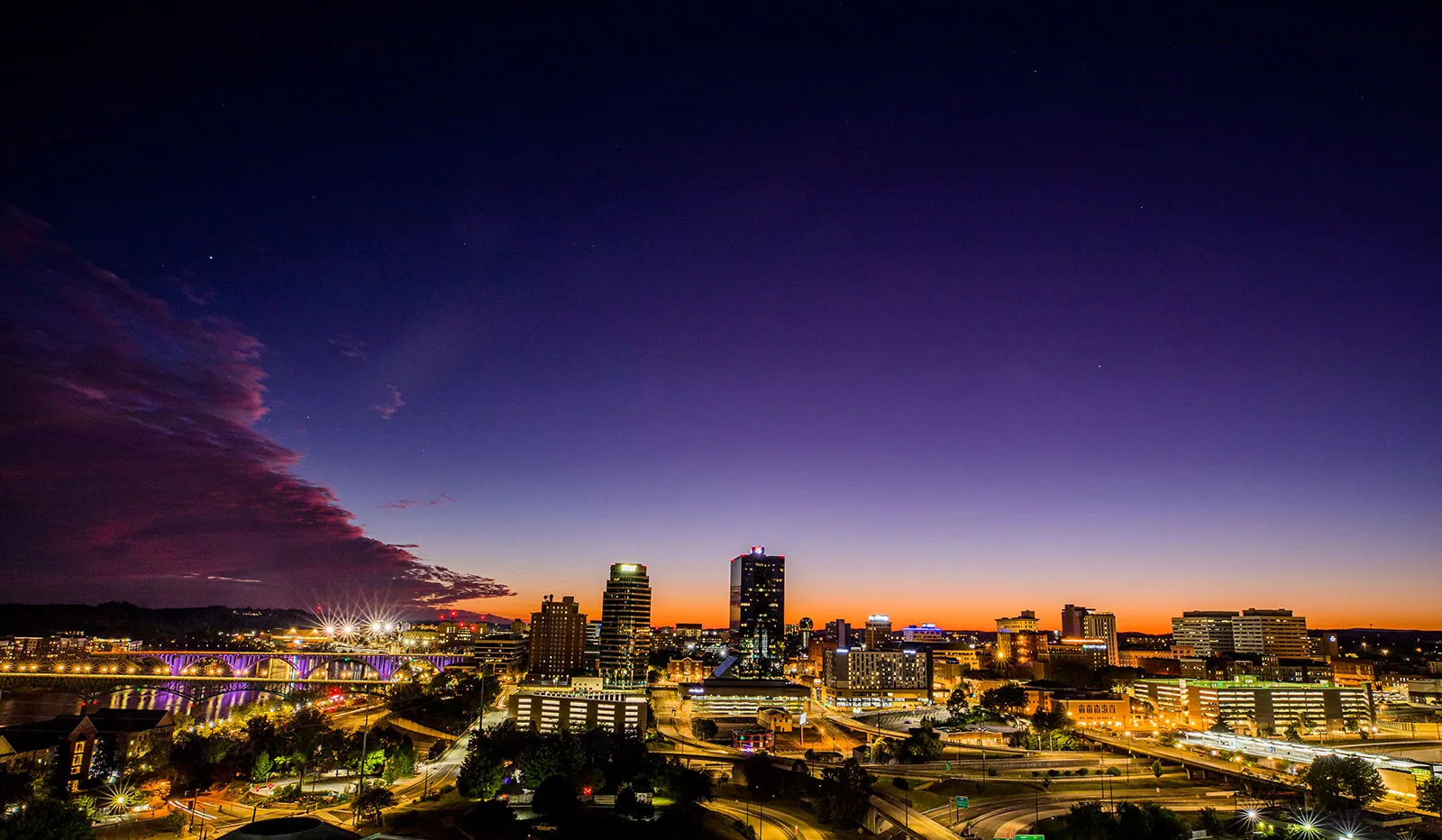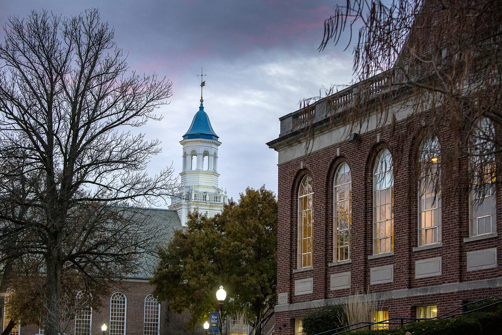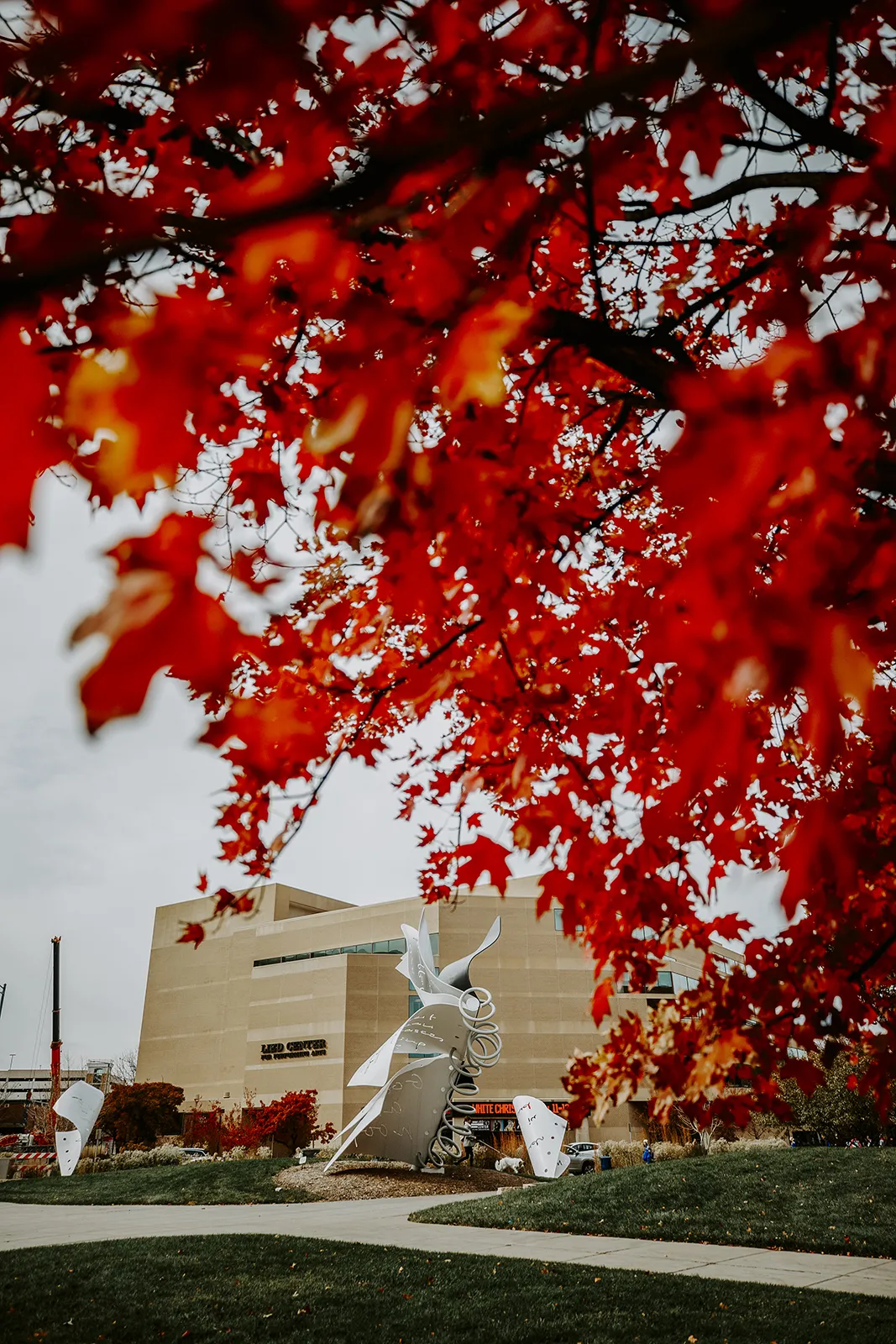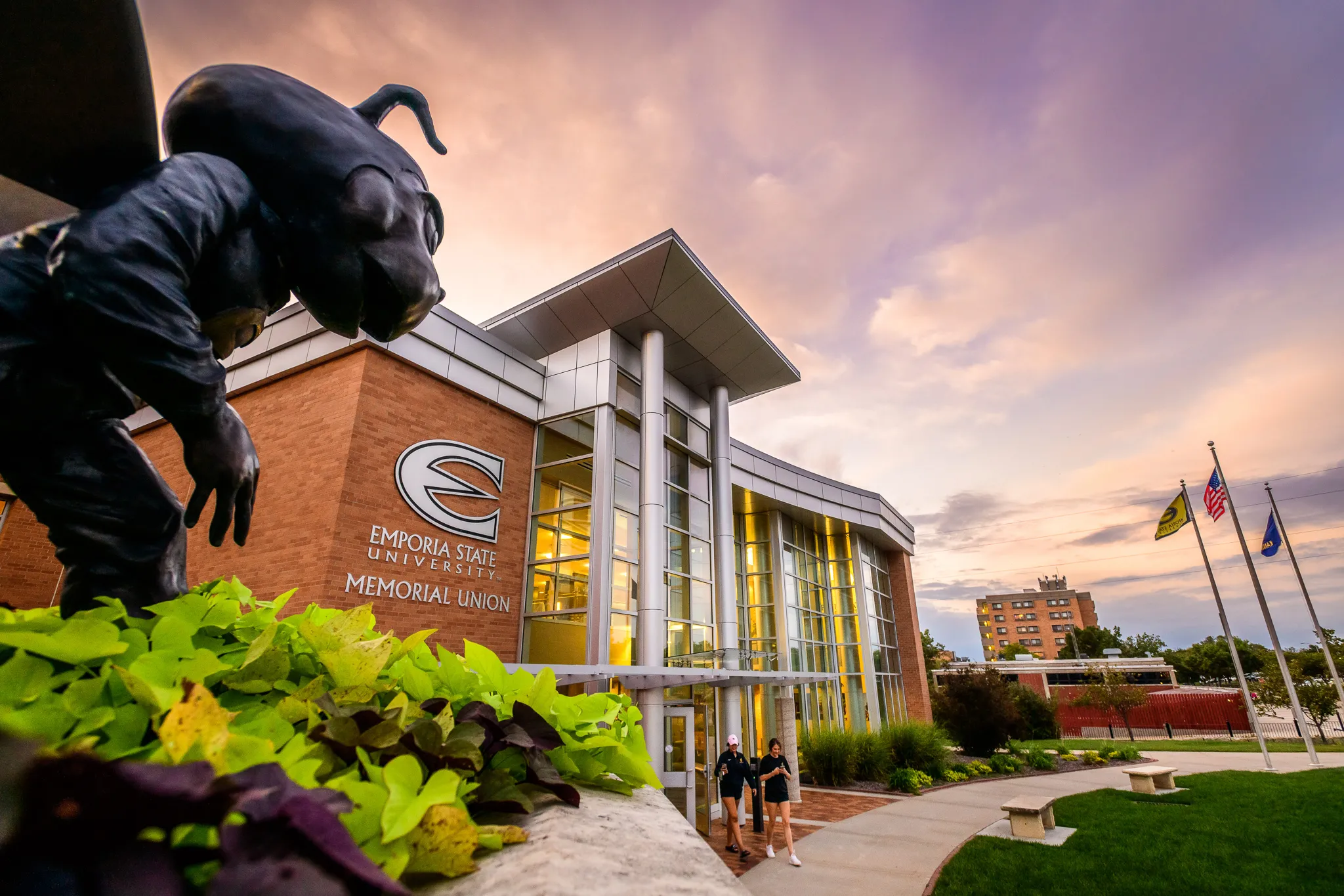 Students walk out of our Memorial Union under one of those awesome Kansas sunsets