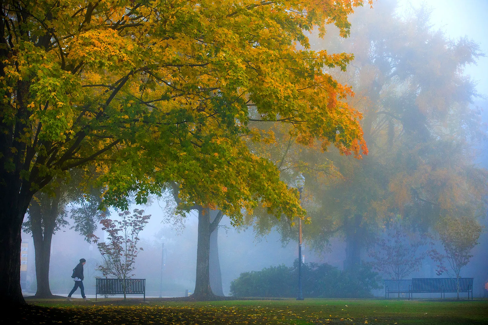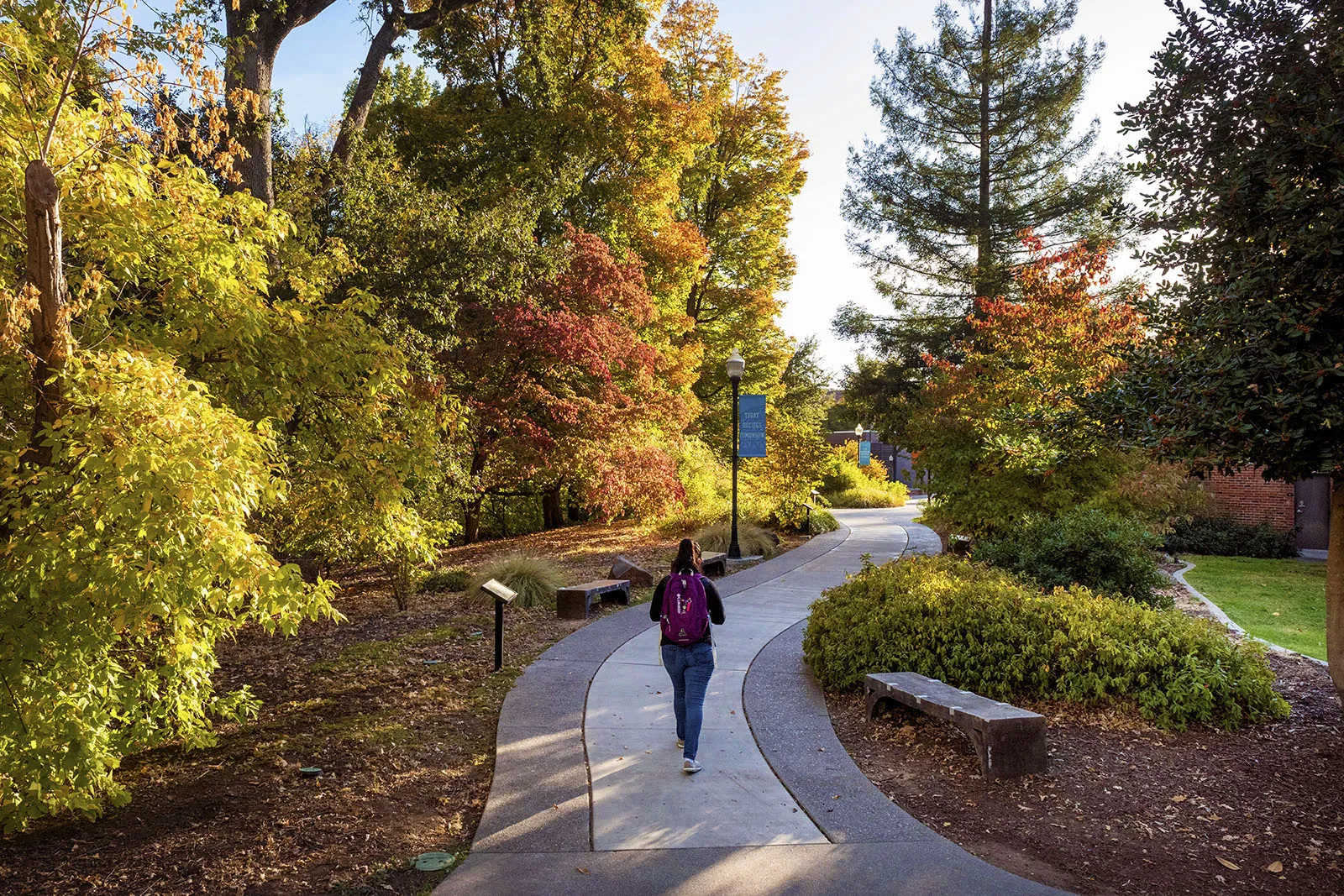 A student walks past the changing colors in the Creekside Educational Garden on Thursday, October 24, 2019.