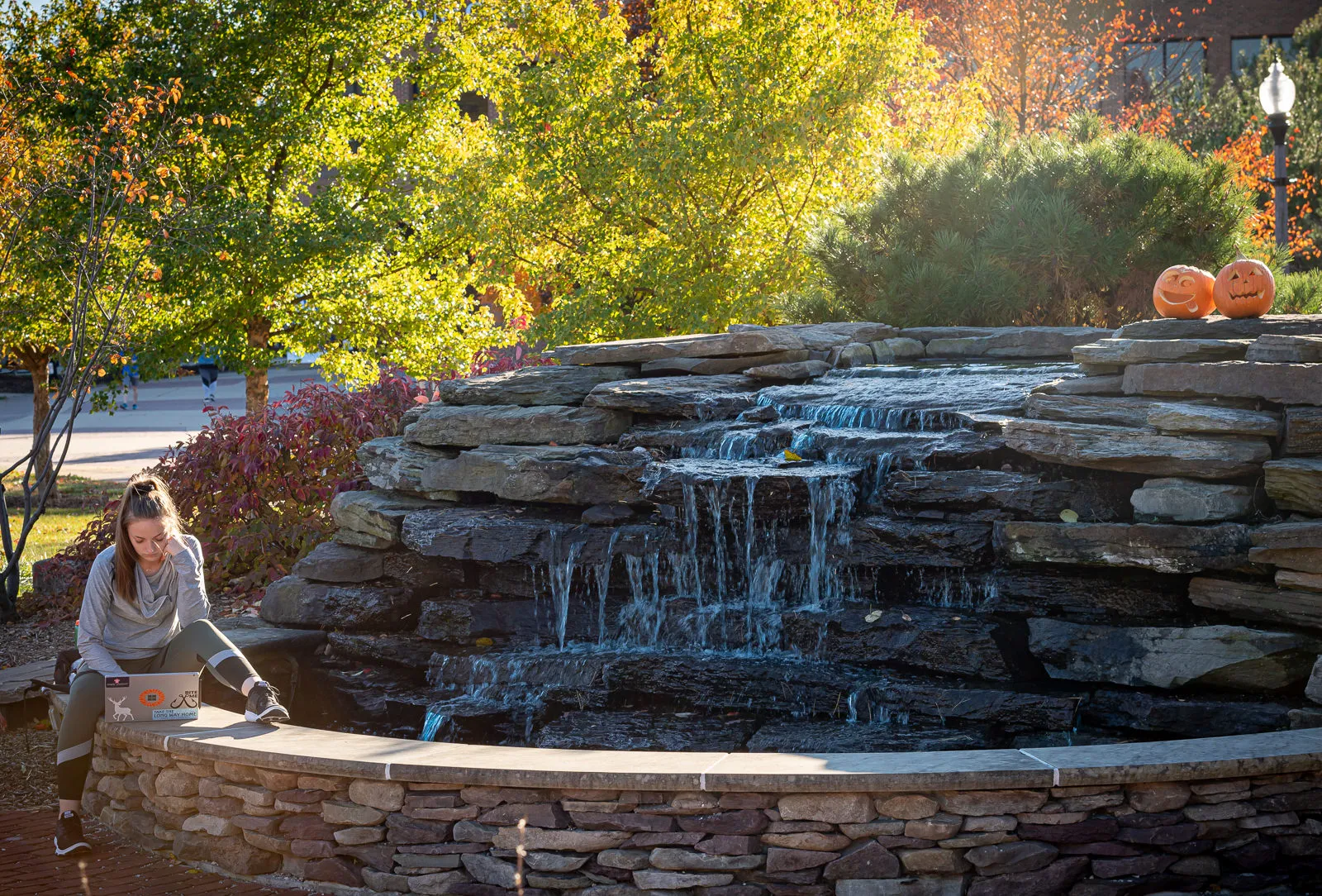 A student finds a serene and festive study spot on the fountain in the Student Memorial Garden near Manchester Field on a mild fall day.