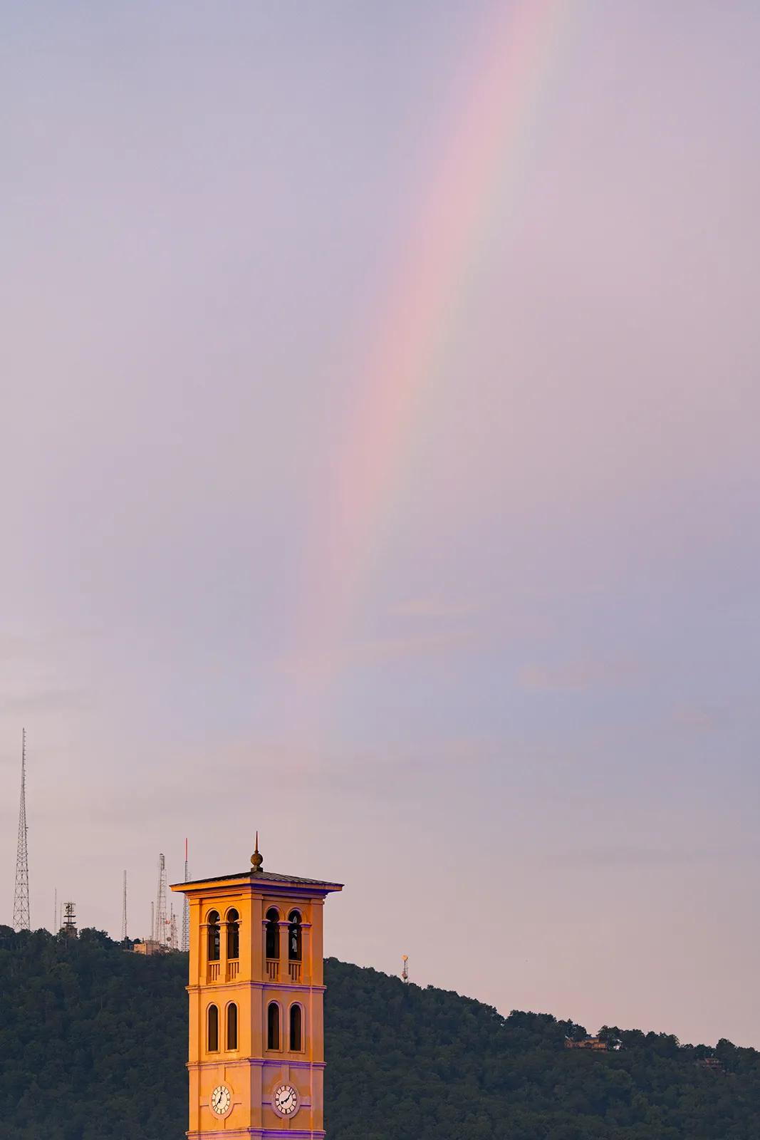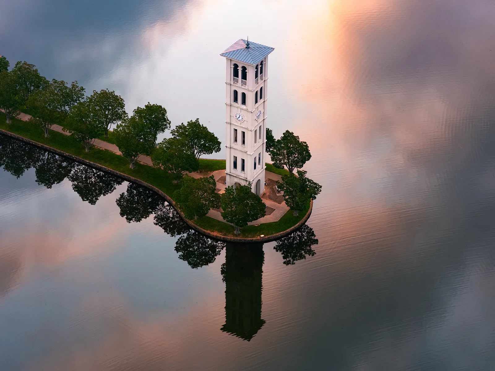 The Bell Tower during a sunrise drone shoot can be seen framed between reflections of the clouds on the morning of June 4th, 2025.