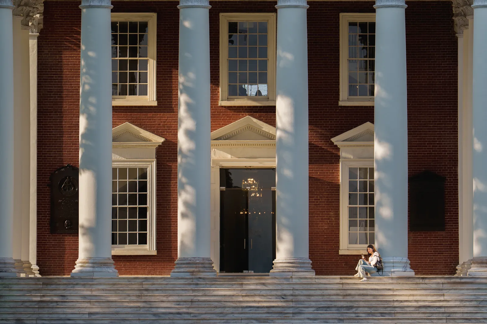 A person sits on the steps of the Rotunda at the University of Virginia on Tuesday, June 10,2025.