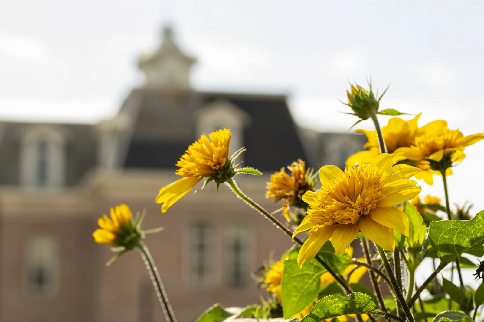 Flowers bloom across campus during the summer months adding color and organic texture to a campus dominated by an eclectic mix of architectural styles.