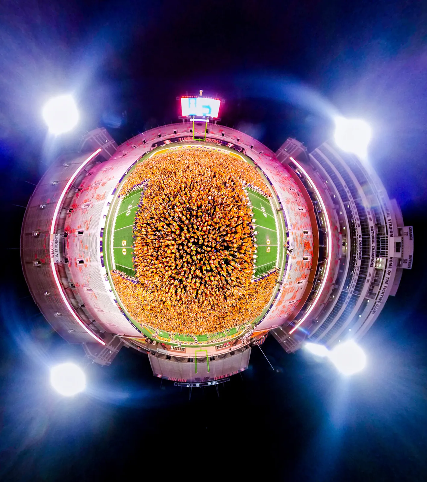 An overhead view from a 360 camera suspended high in the air captures the scene as the largest incoming class ever gather for the Sights & Sounds program for incoming students.