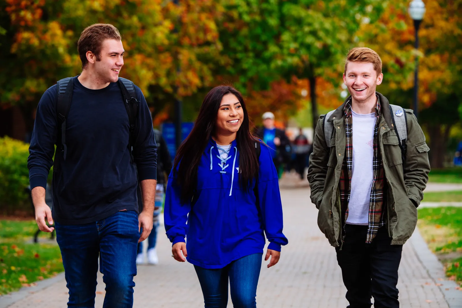 Student couple enjoying a bike ride through campus in the fall leaves.