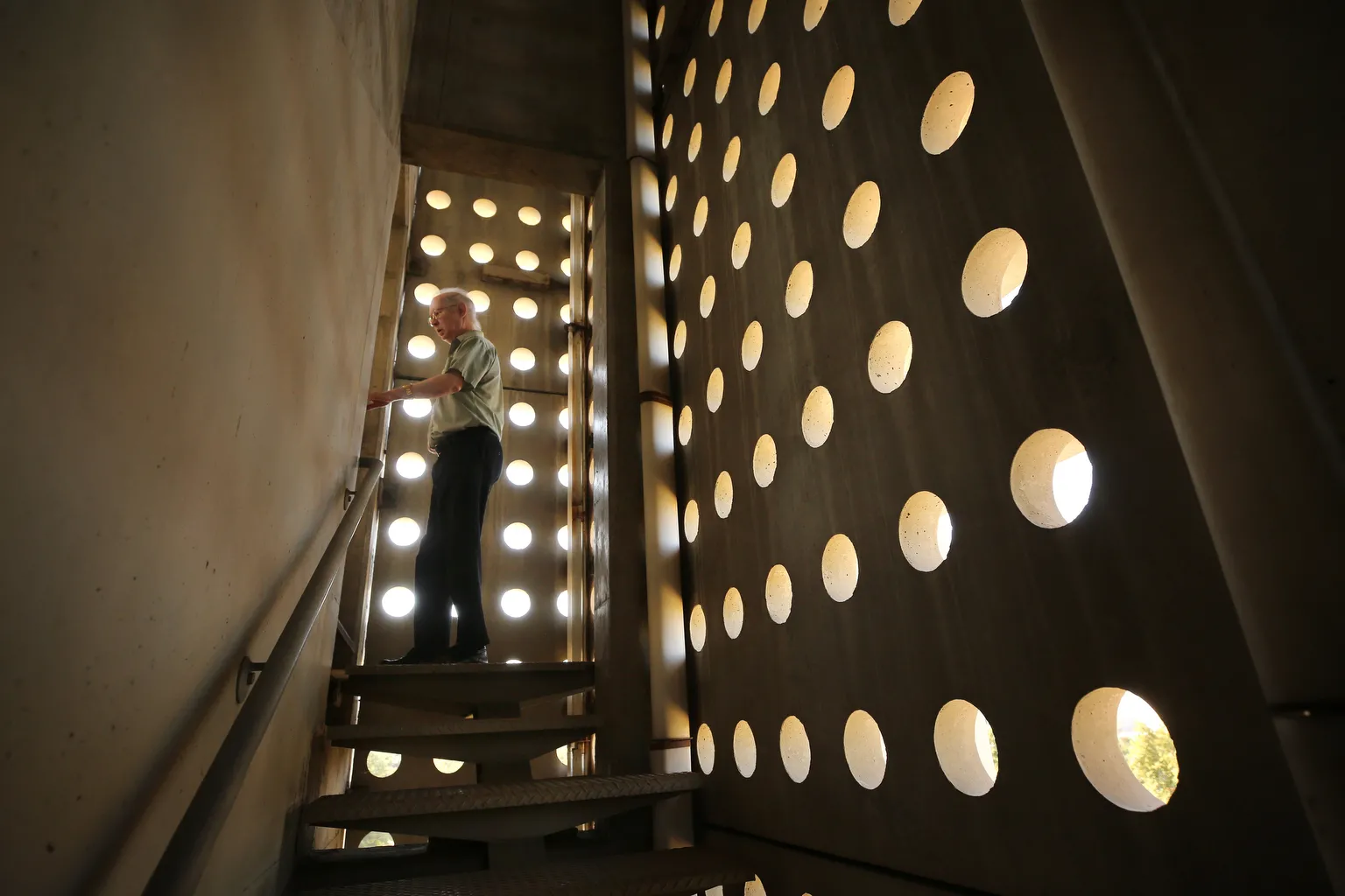 UC Riverside carillonneur David Christensen takes the stairs up to the top of the bell tower on Wednesday, October 9, 2019. The carillon, which is housed in the top of the bell tower, will go through some repairs and much needed attention.
