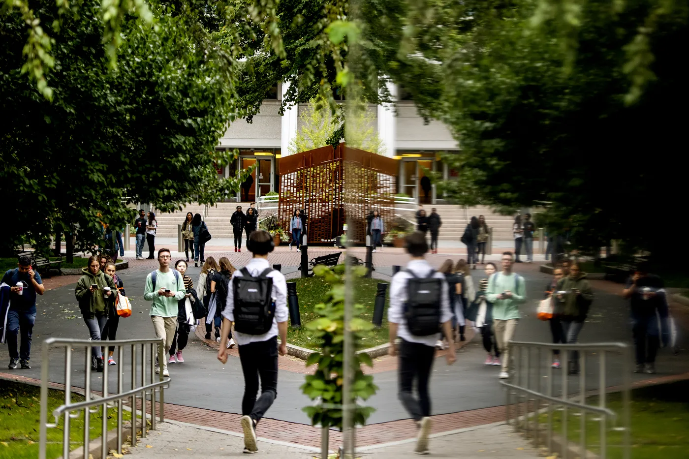 Students are reflected in the Veterans Day memorial as they walk through campus.